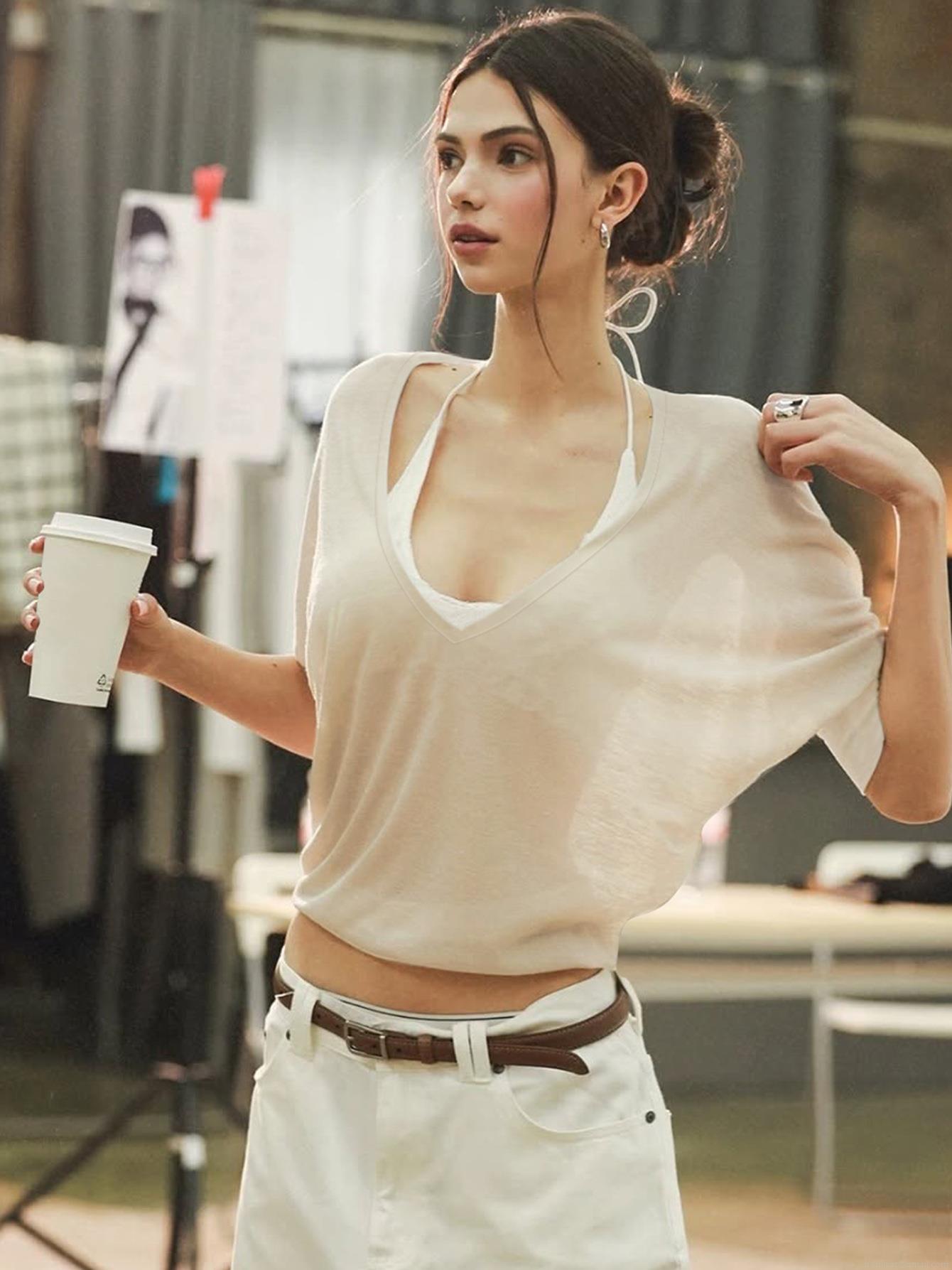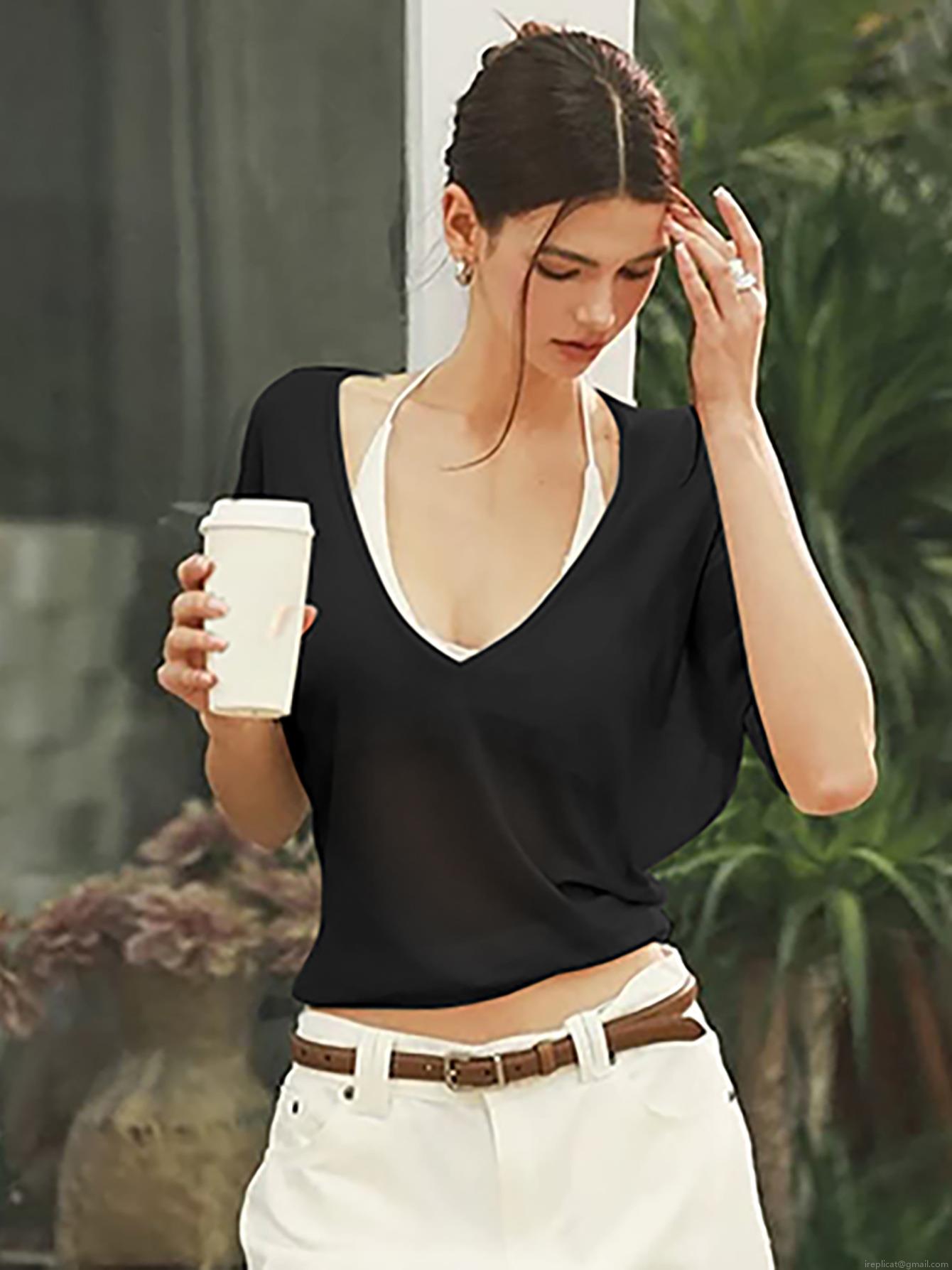 Women's See-through V-neck Sun Protection Blouse 80% Polyester 20% Spandex Sexy Niche Design Loose Long Short Sleeve T-shirt Streetwear Summer Top for Women