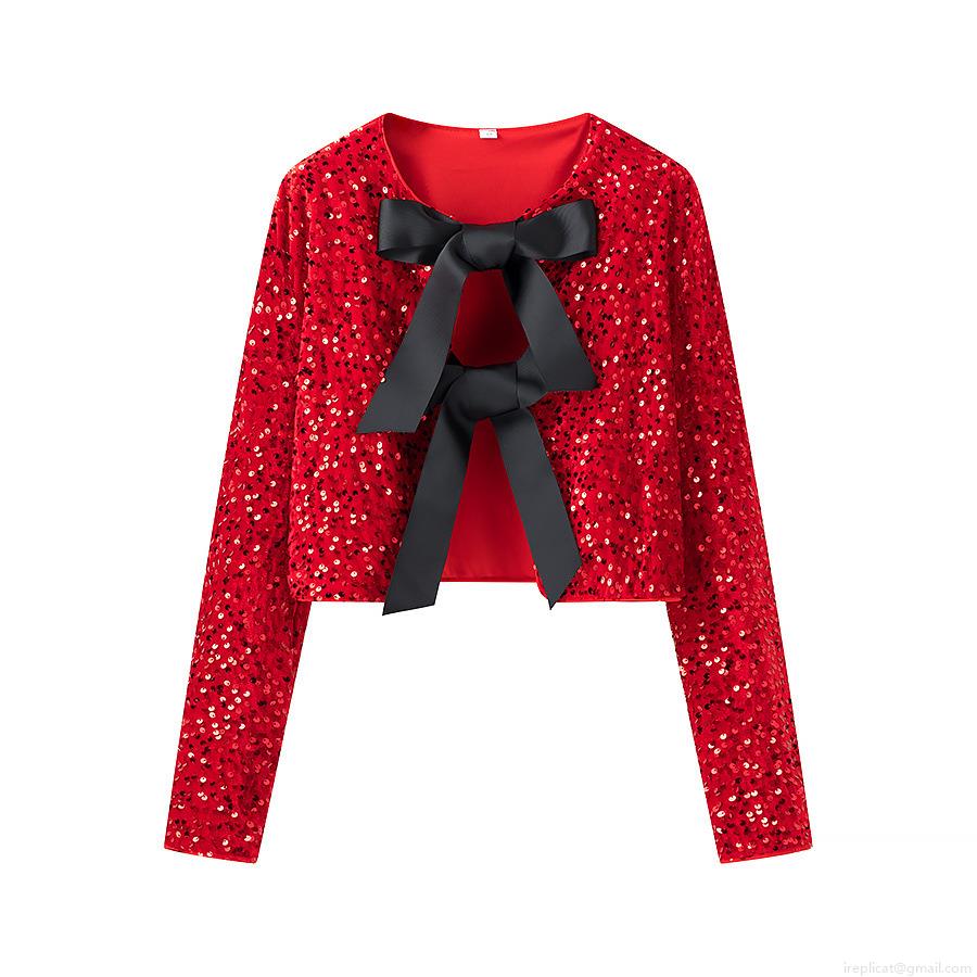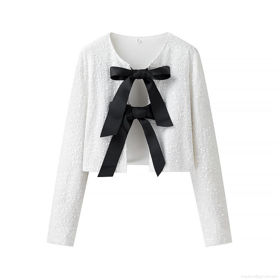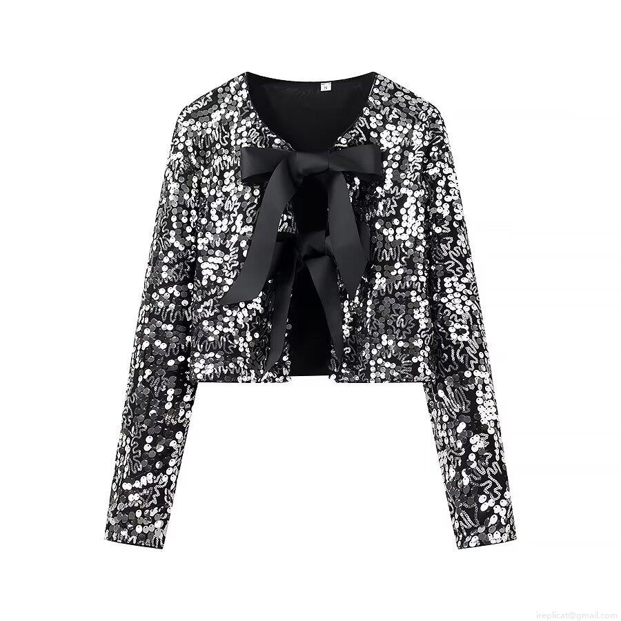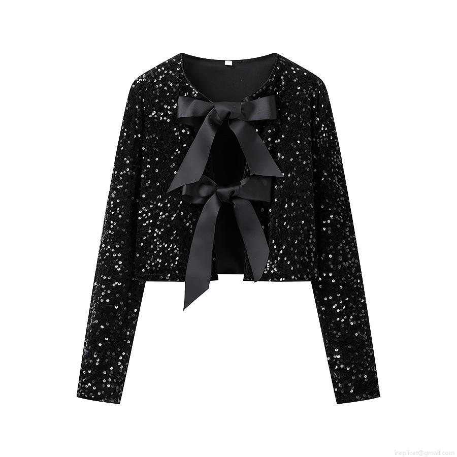 • Women's Sequined Bow Knot Cardigan Long Sleeve Crop Top Polyester Sequin Satin Ribbon Tie Up Bolero Jacket For Party Clubwear Christmas New Year Glamorous Streetwear