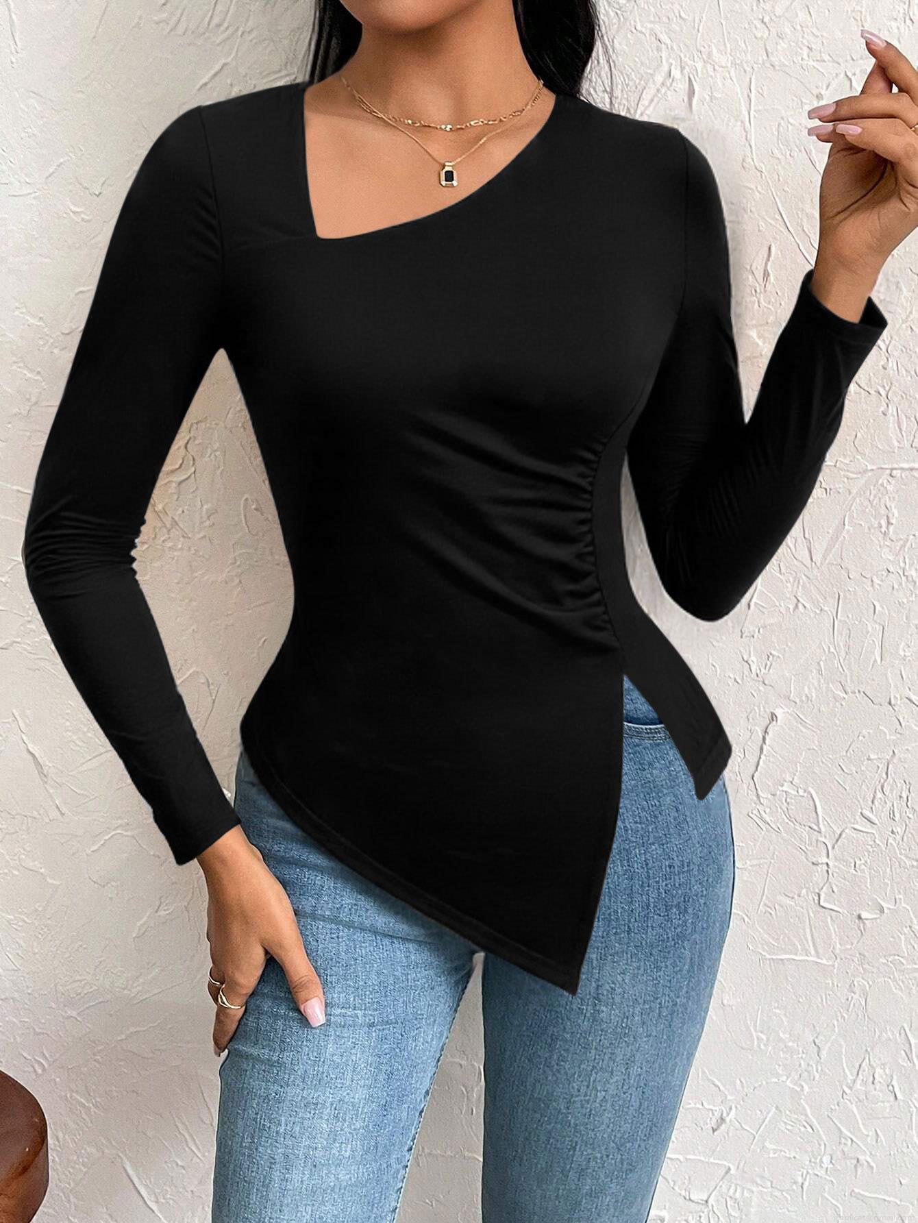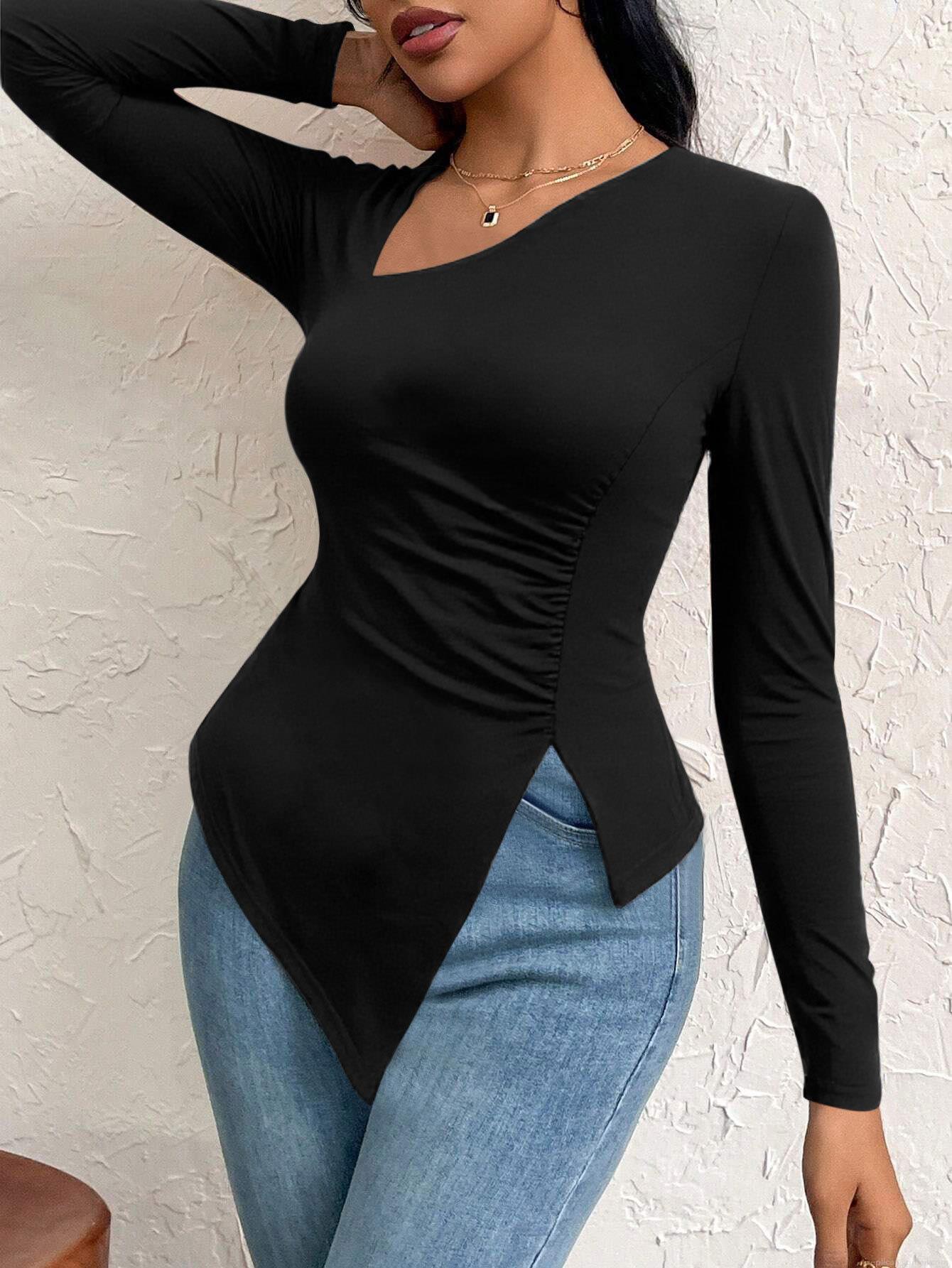 • Women's Sexy Asymmetric Neck Long Sleeve T-Shirt Elegant Ruched Slim Fit Top With Irregular Split Hem For Daily Commute Fashion
