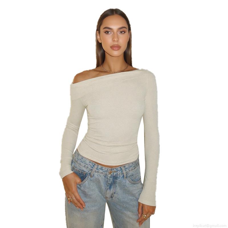 • Women's Sexy Asymmetric Off-Shoulder Long Sleeve T-Shirt Slim Fit Pleated Polyester Knit Top Casual Elegant Solid Color Blouse for Women Party Dating