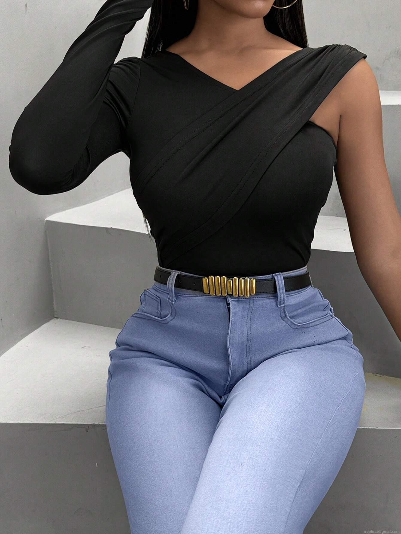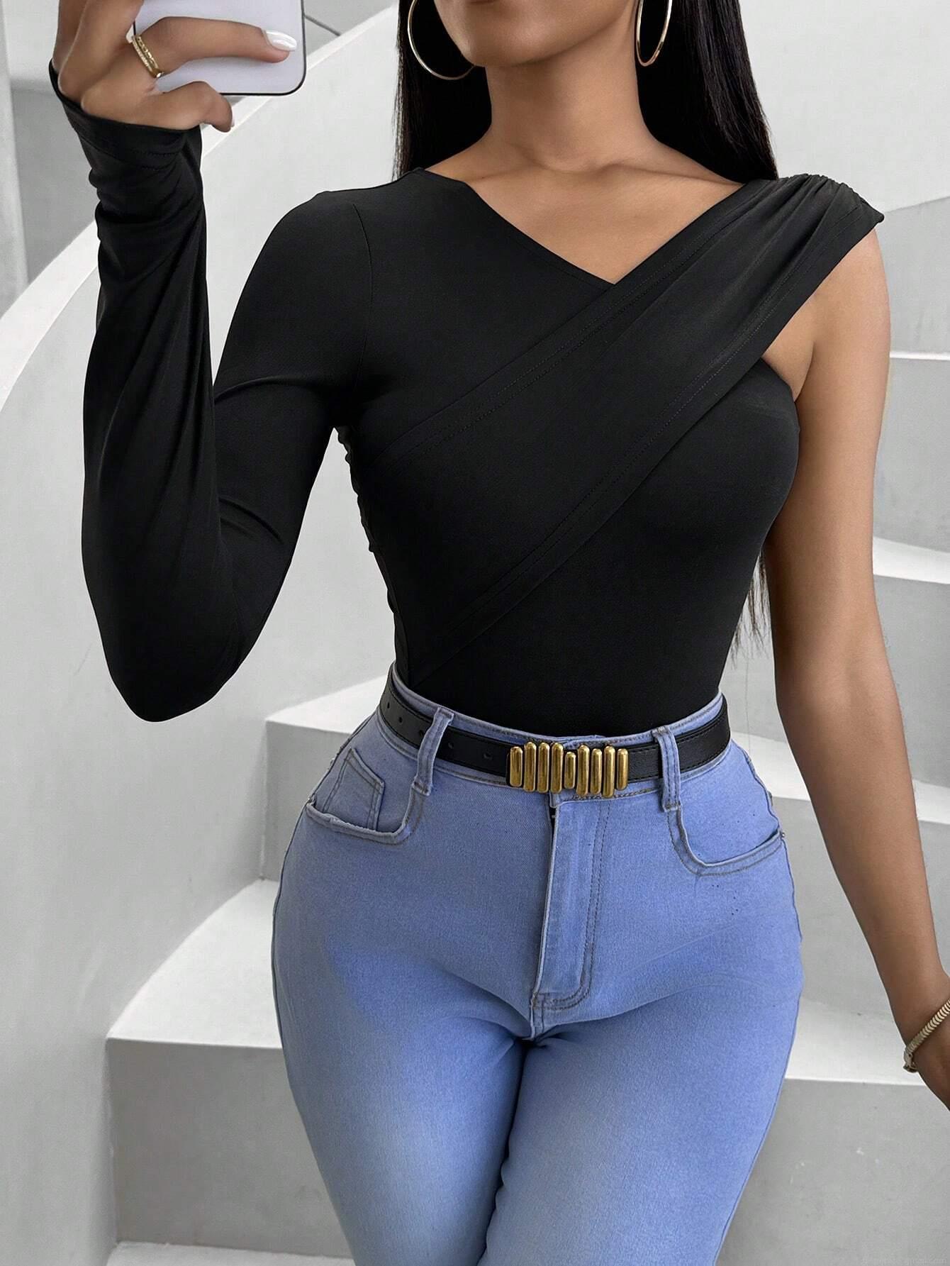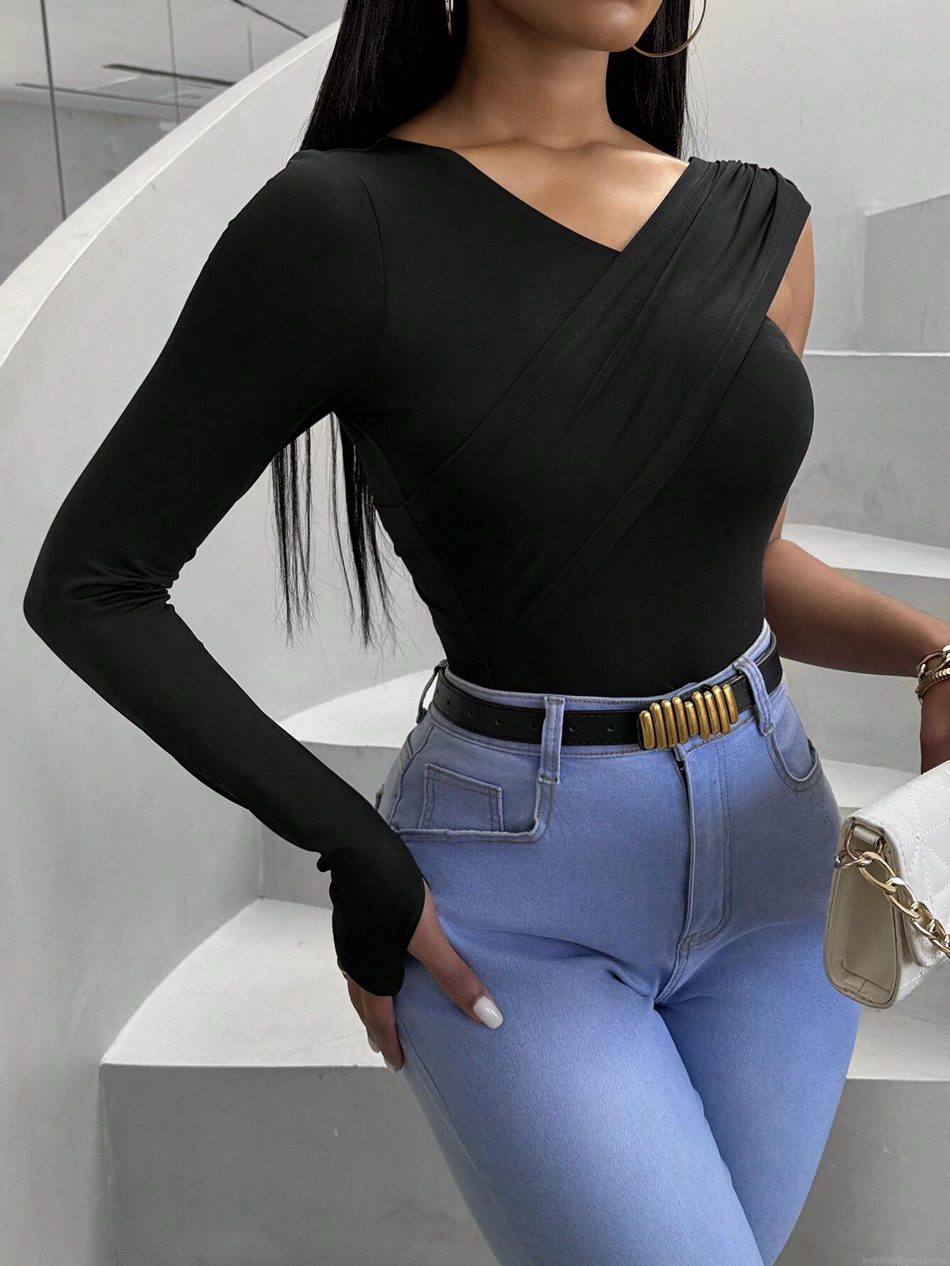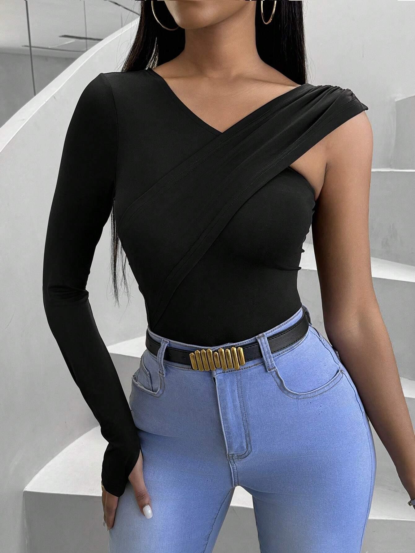 • Women's Sexy Asymmetric One-Shoulder Long Sleeve T-Shirt Slim Fit Cross V-Neck Solid Color Polyester Elastane Ribbed Top Streetwear for Daily Dating Party