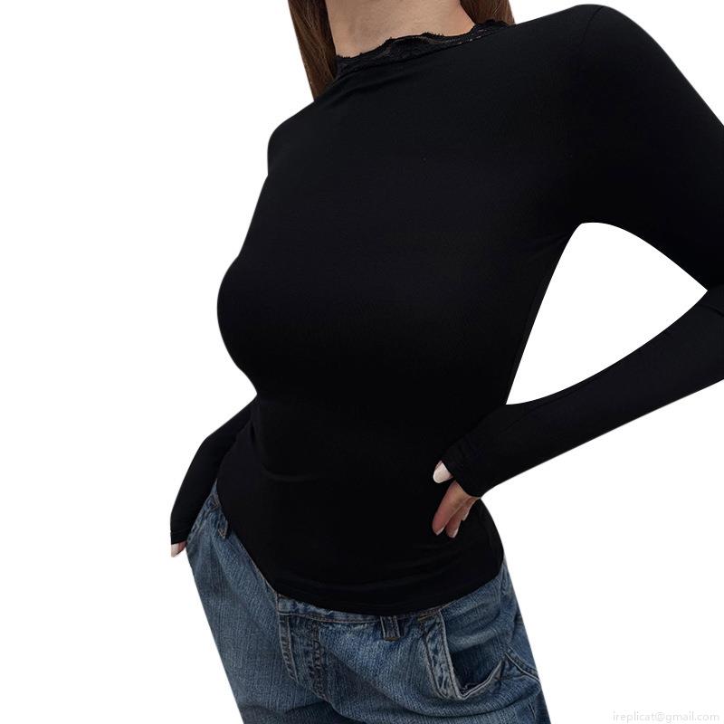 Women's Sexy Backless Long Sleeve T-Shirt Lace Patchwork Ribbed Mock Neck Slim Fit Crop Top Solid Color Casual Streetwear
