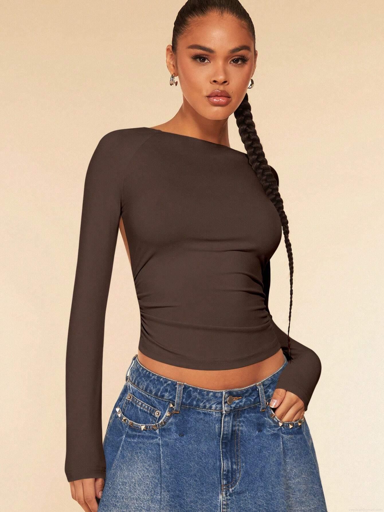 • Women's Sexy Backless Long Sleeve T-Shirt Ruched Slim Fit Viscose Elastane Top Chic Round Neck Solid Color Soft Breathable Autumn Winter Clubwear Streetwear Outfit