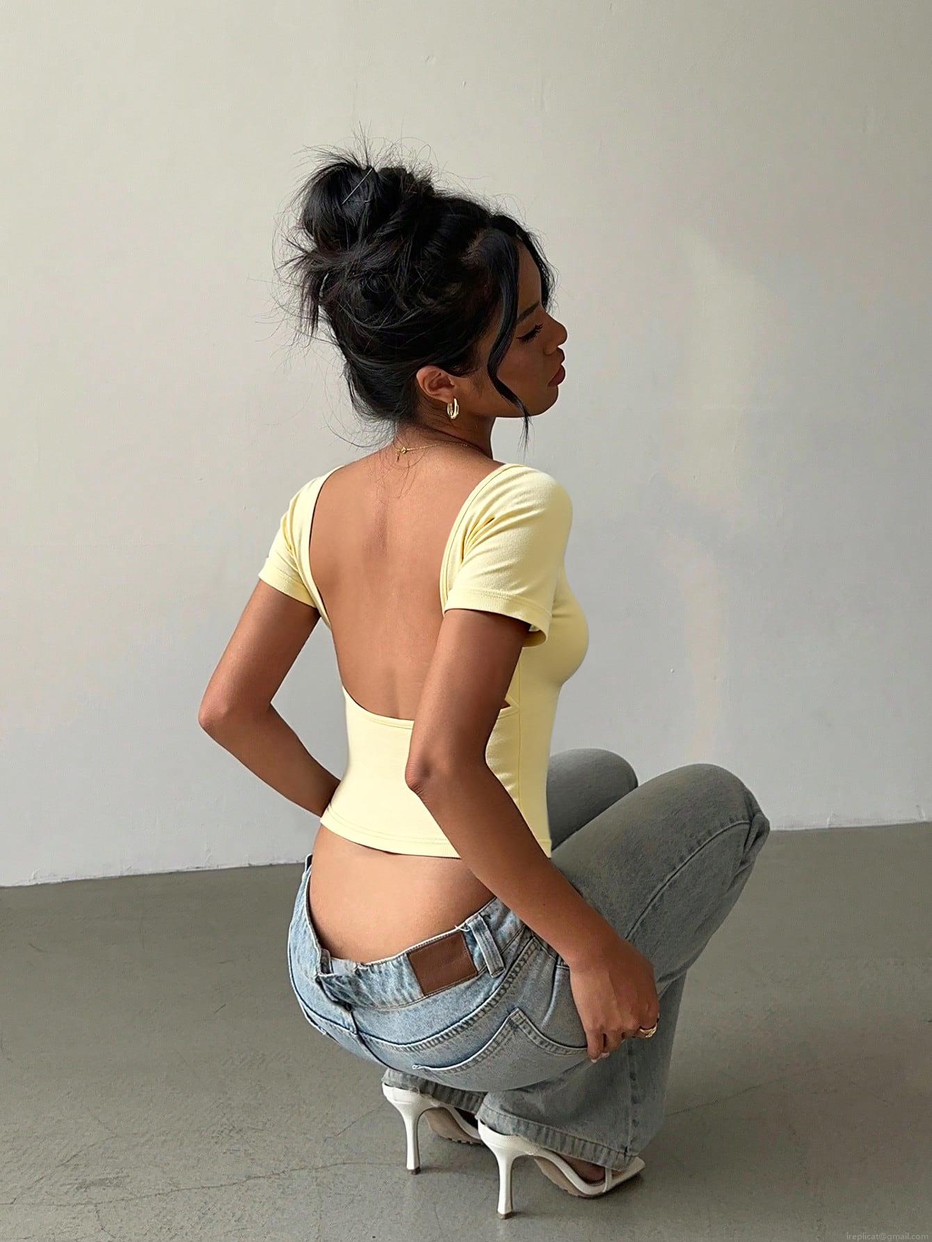 • Women's Sexy Backless Short Sleeve T-Shirt Slim Fit Cropped Round Neck Solid Color Polyester Elastane Blend Summer Top For Ladies