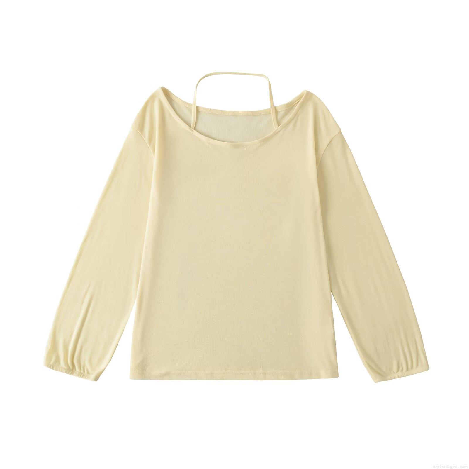 Women's Sexy Cold Shoulder Long Sleeve T-Shirt Polyester Solid Color Round Neck Top With Hanging Neck Strap Fake Two Piece Streetwear Tee