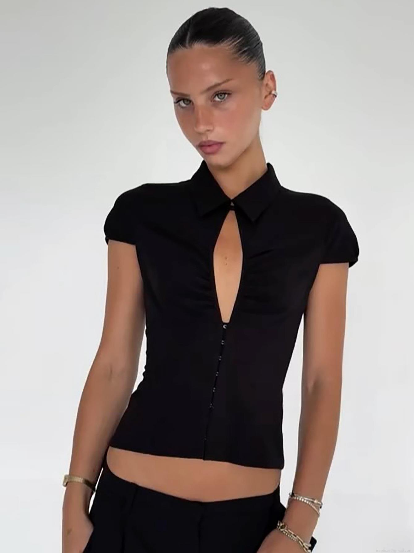 • Women's Sexy Cutout V-Neck Short Sleeve T-Shirt 100% Polyester Ruched Hook-and-Eye Slim Fit Polo Shirt Streetwear Summer Top