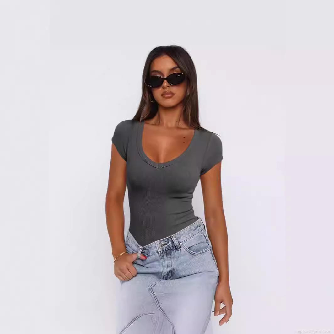 • Women's Sexy Deep Scoop Neck Ribbed T-Shirt Slim Fit Short Sleeve Viscose Knit Top Casual Solid Color Basic Summer Streetwear Tee