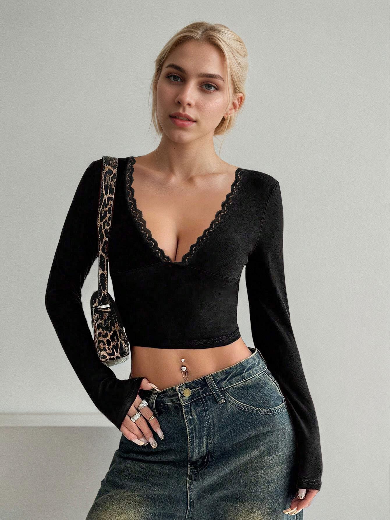 • Women's Sexy Deep V-Neck Lace Trim Long Sleeve Crop Top Slim Fit Solid Color Polyester Tee Sweet Spicy Style Ribbed Base Layer Shirt For Daily Party