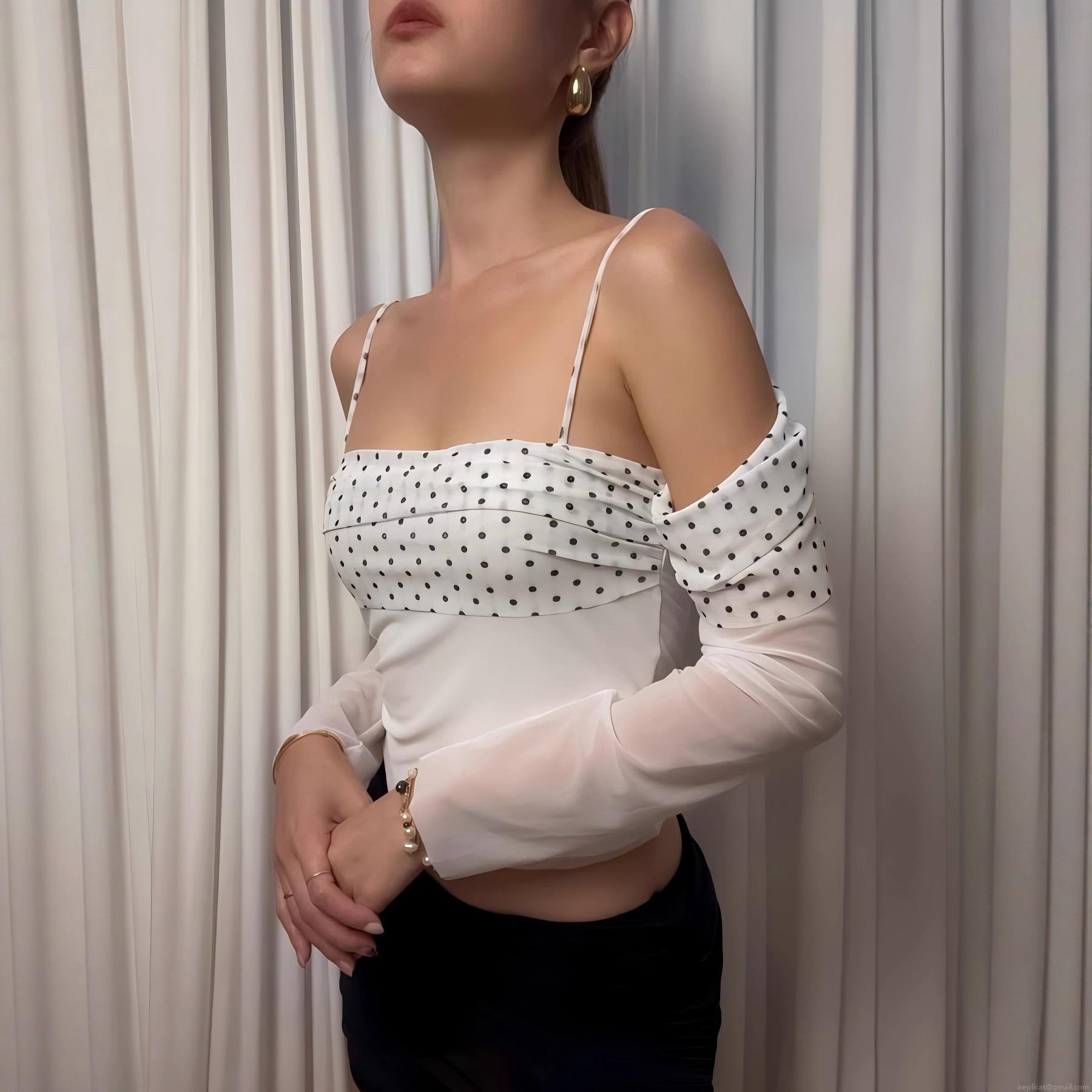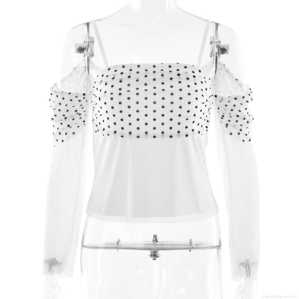 • Women's Sexy French Style Polka Dot Off Shoulder Long Sleeve T-Shirt Mesh Patchwork Slim Fit Top Streetwear Club Party Blouse White