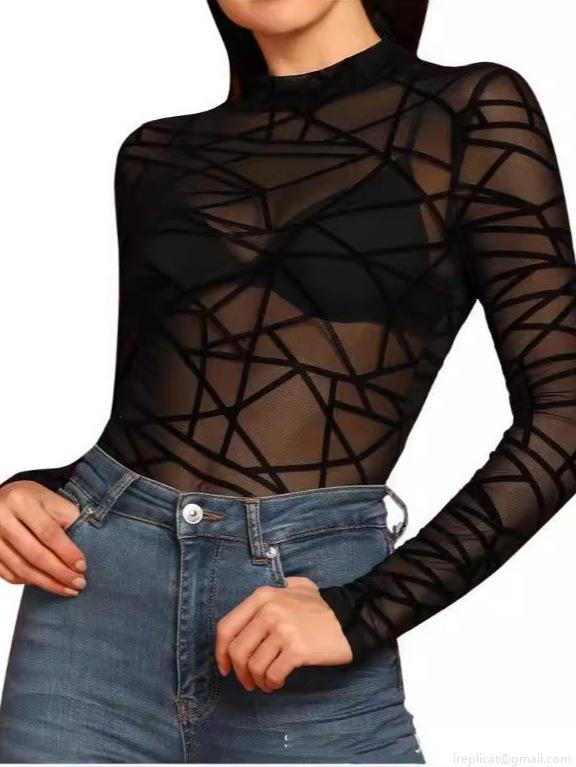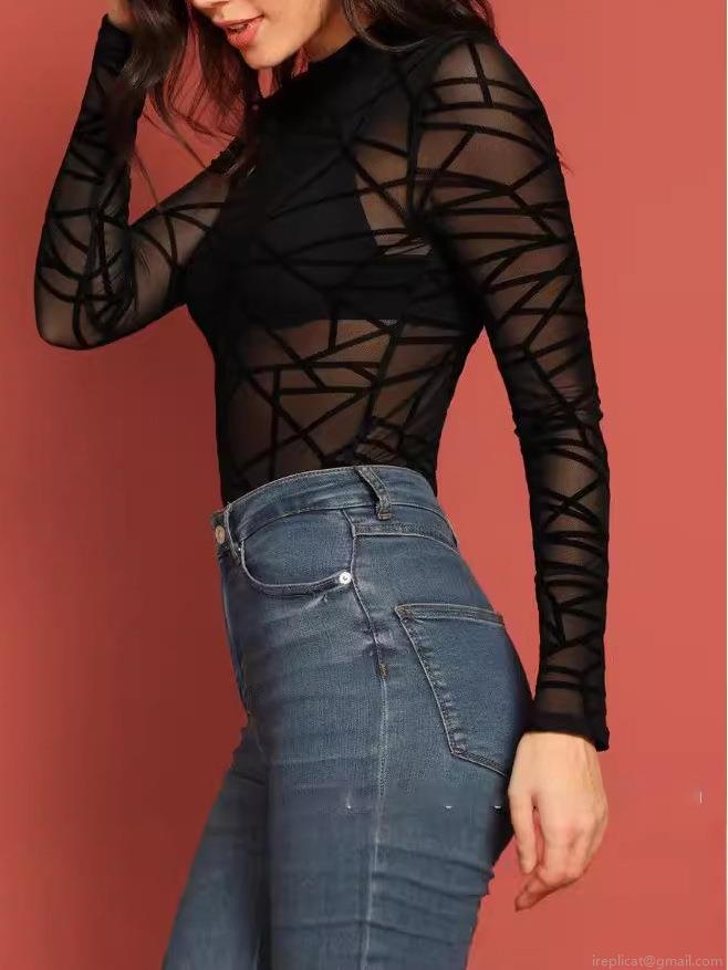 • Women's Sexy Geometric Flocking Mesh Top Sheer See Through Long Sleeve T-Shirt Mock Neck Tight Slim Fit Tee For Party Clubwear Fashion Women's Clothing