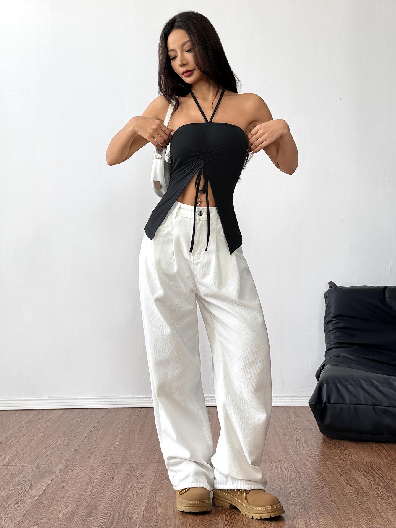 • Women's Sexy Halter Neck Crop Top Ruched Drawstring Cotton Polyester Blend Sleeveless Slim Fit Summer T-Shirt Streetwear Clubwear Black