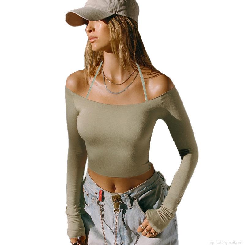 • Women's Sexy Halter Off-Shoulder Long Sleeve Crop Top Solid Ribbed Knit Polyester Slim Fit American Streetwear Y2K Aesthetic Tee
