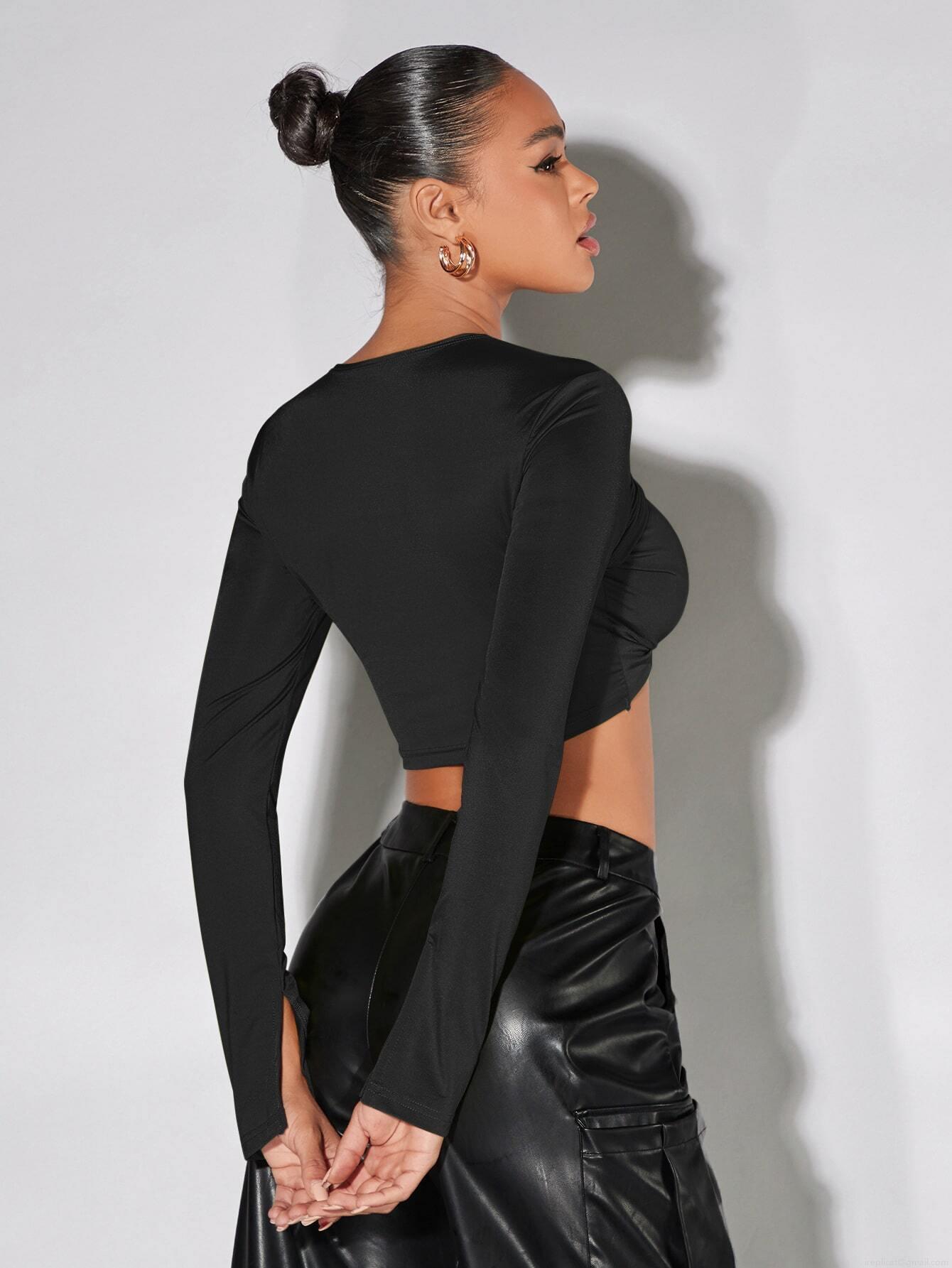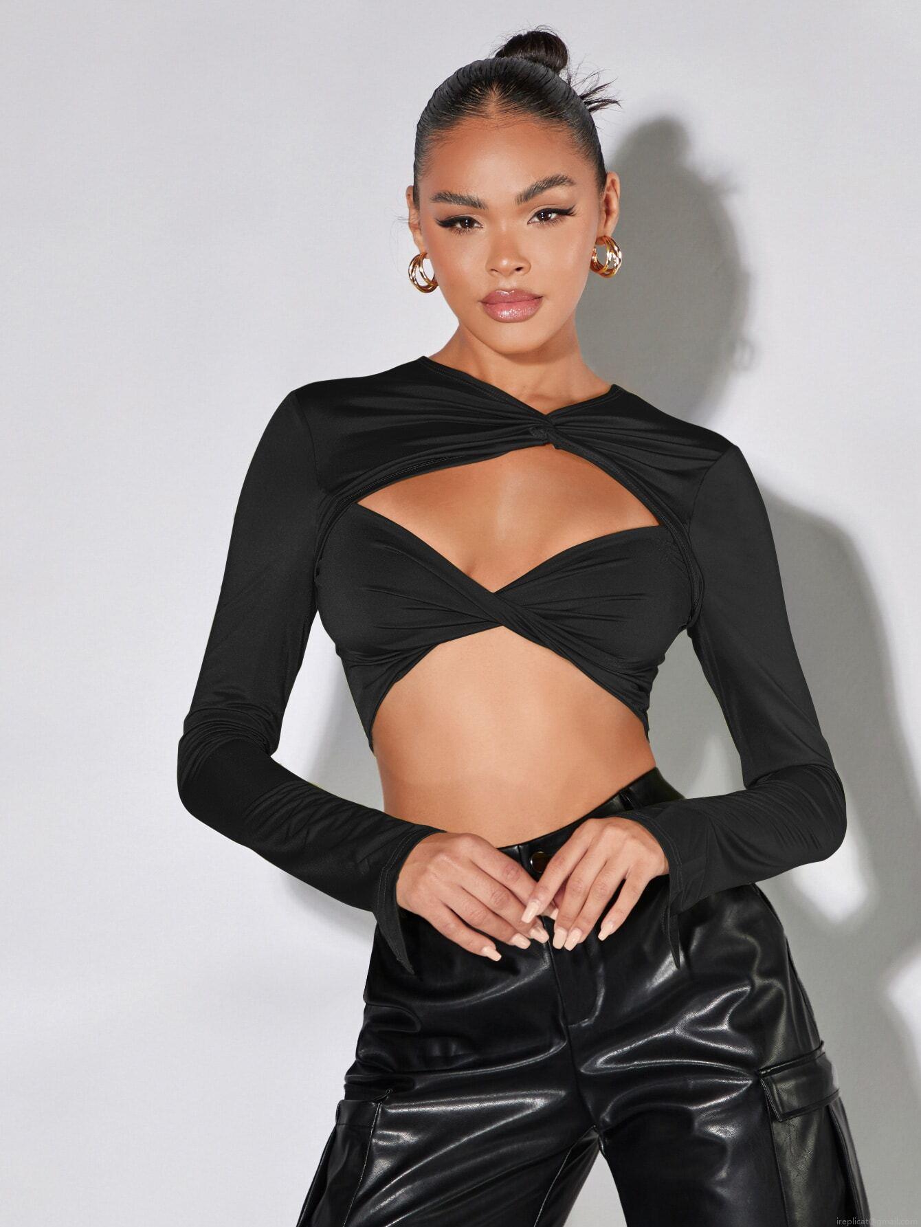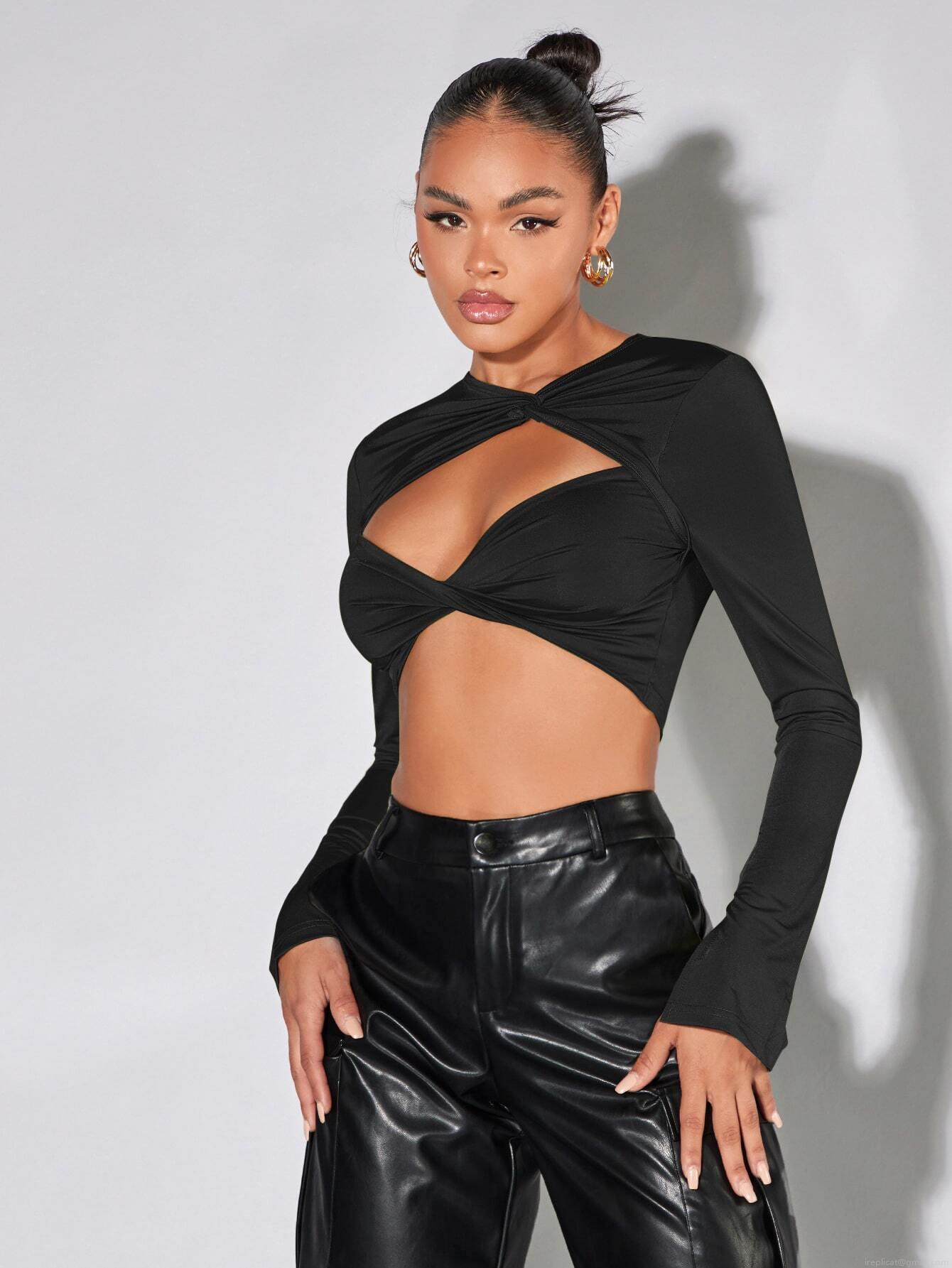 • Women's Sexy Hollow Out Twist Front Long Sleeve Crop Top Slim Fit Solid Color Polyester Rib Knit T-Shirt For Streetwear Party Clubwear Autumn