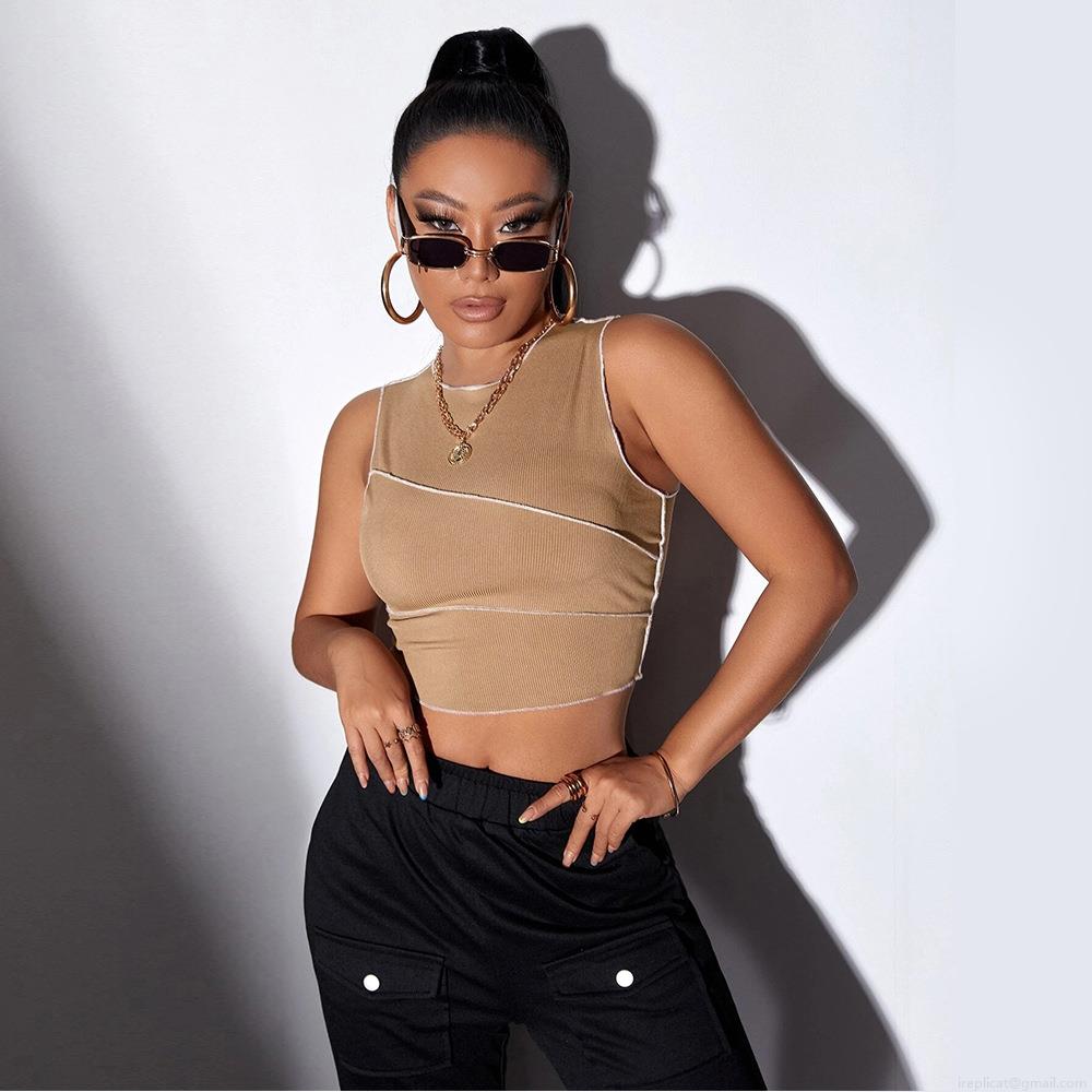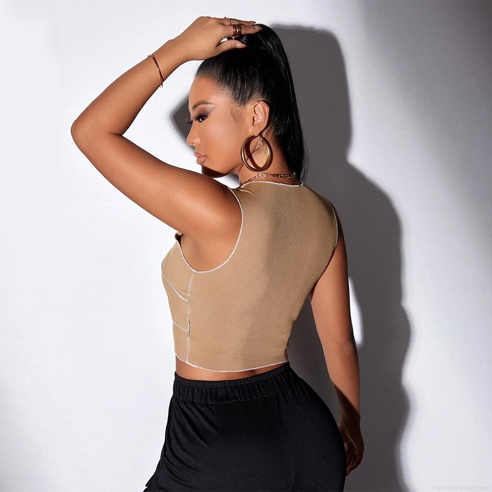 • Women's Sexy Khaki Ribbed Crop Top Sleeveless Slim Fit Tank Top With Contrast Seams Basic Round Neck Summer T-Shirt For Streetwear Women