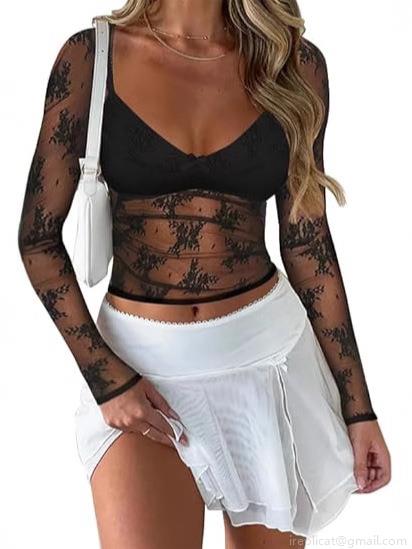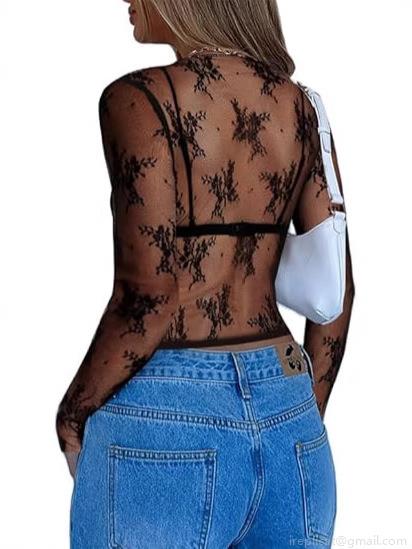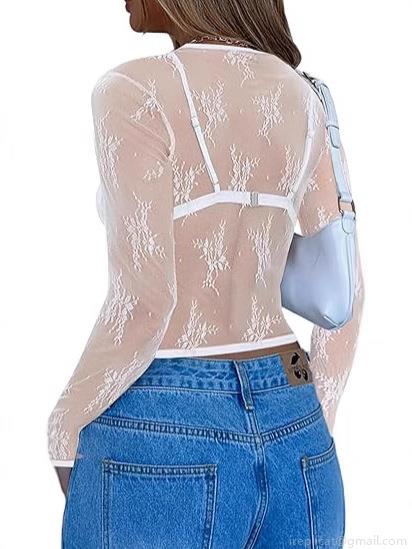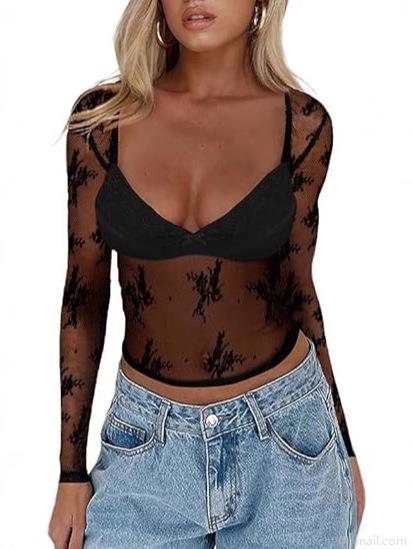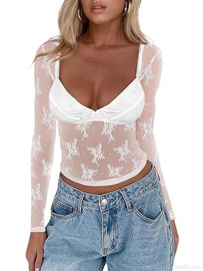 • Women's Sexy Lace Mesh Long Sleeve Top V Neck Floral See Through Slim Fit Pullover Blouse Base Layer Streetwear Clubwear Party Clothing For Women