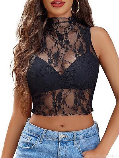 • Women's Sexy Lace Mesh Mock Neck Sleeveless Crop Top Sheer Floral Hollow Out Slim Fit Pullover T-Shirt Summer Party Clubwear