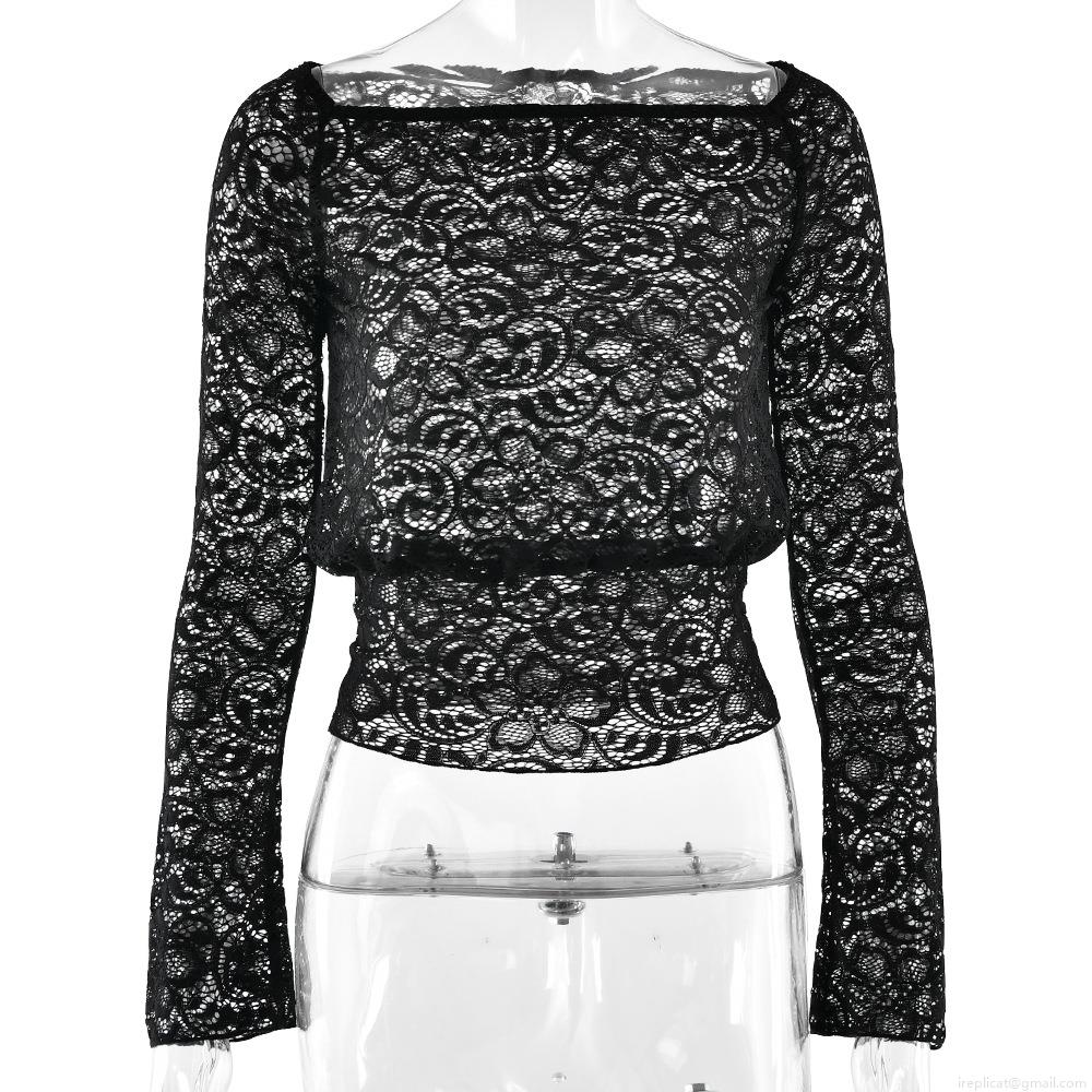 • Women's Sexy Lace Perspective Long Sleeve T-Shirt Elegant Off-Shoulder Slim Fit Black Mesh Floral Top For Party Streetwear Daily Wear
