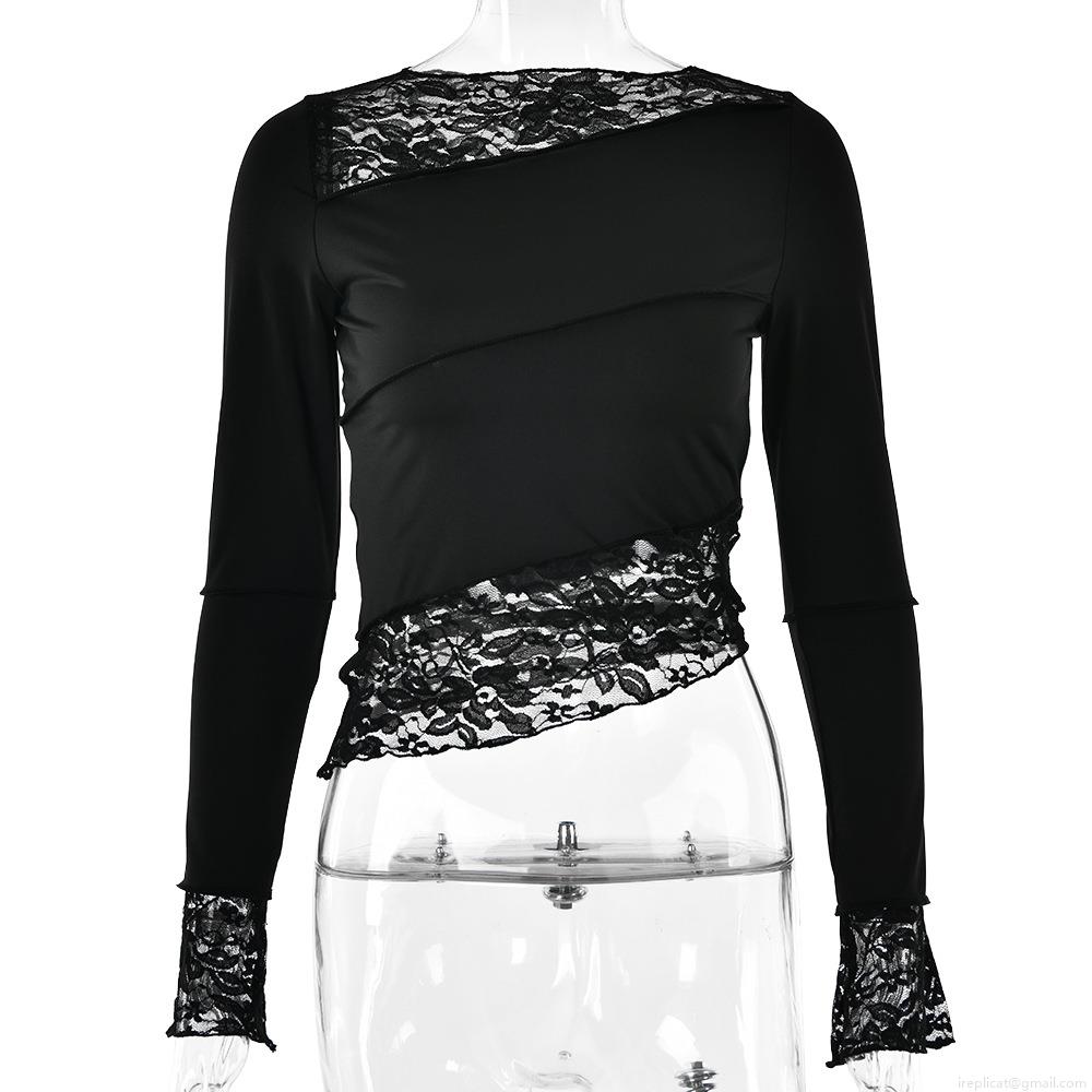 Women's Sexy Lace Splicing T-Shirt Slim Fit Long Sleeve Round Neck Top Perspective Solid Color Streetwear Mesh Patchwork Blouse