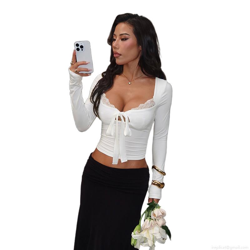 • Women's Sexy Lace Trim Square Neck Long Sleeve Top French Vintage Bow Tie Front Slim Fit Crop T-Shirt White Black Streetwear Party Clothing