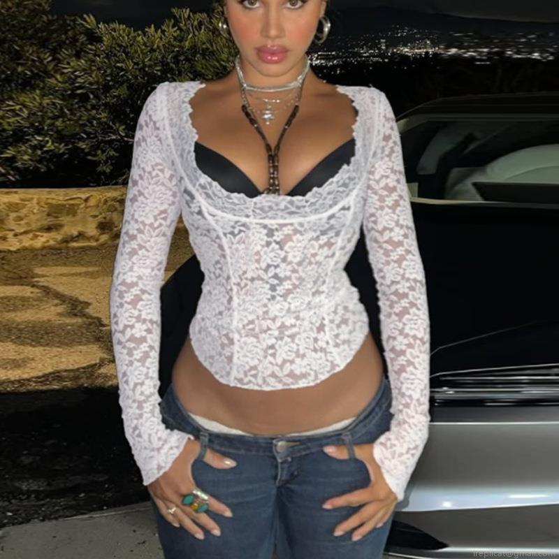 • Women's Sexy Lace T-Shirt Polyester Hollow Out Patchwork Long Sleeve Cropped Top White Floral Mesh V-Neck Blouse Slim Fit Party Clubwear Streetwear For Ladies
