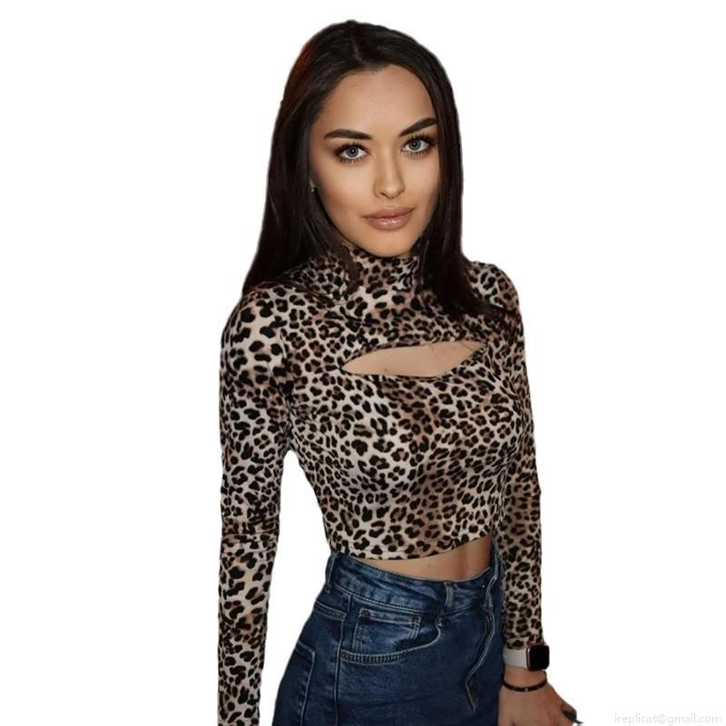 • Women's Sexy Leopard Print Crop Top Mock Neck Cut Out Front Long Sleeve Slim Fit T-Shirt Streetwear Clubwear Party Fashion Aesthetic Top