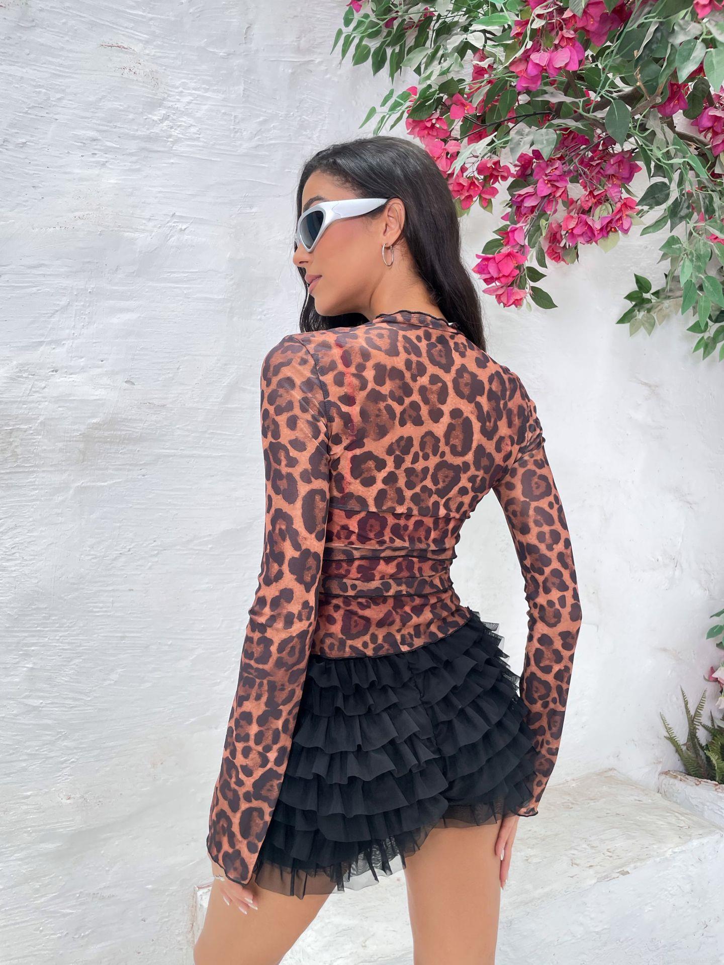 Leopard Print, Animal Print, Wood Ear Edge, Ruffles, Printing, Lace, Mesh See-through