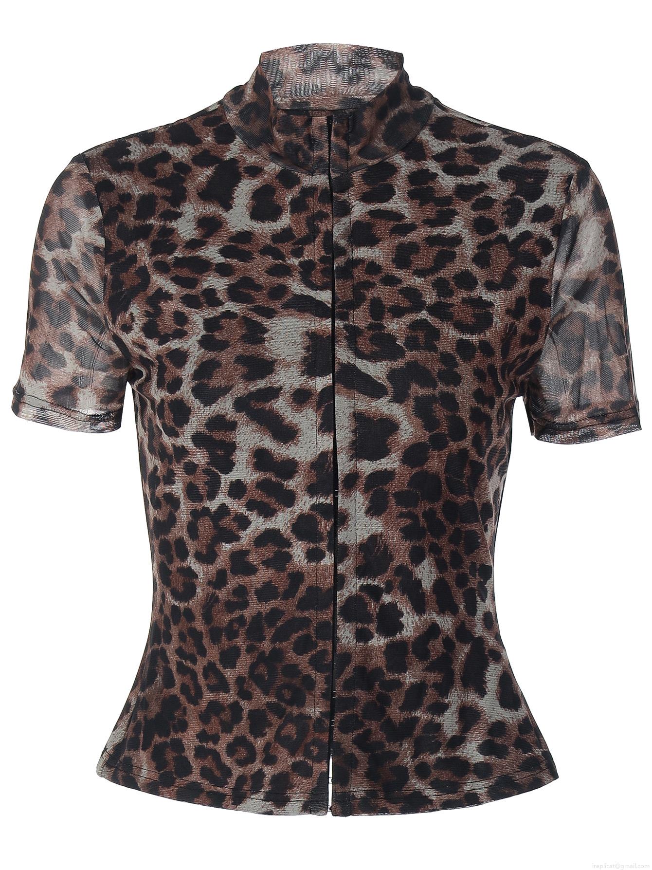 • Women's Sexy Leopard Print Mesh T-Shirt Short Sleeve Slim Fit Half High Neck Sheer Top For Clubwear Party Streetwear Polyester Spandex