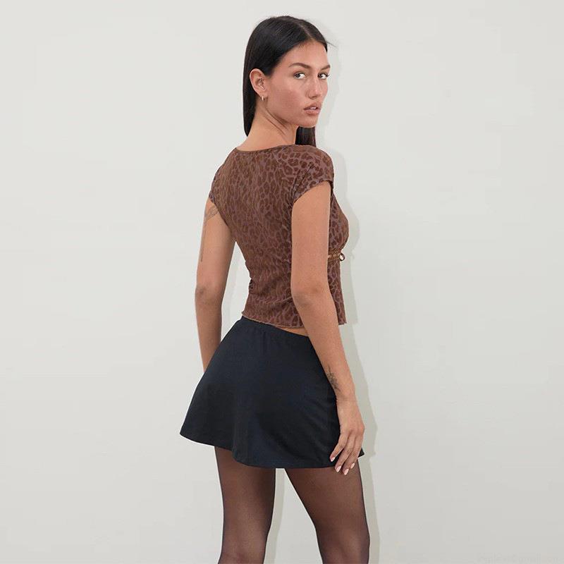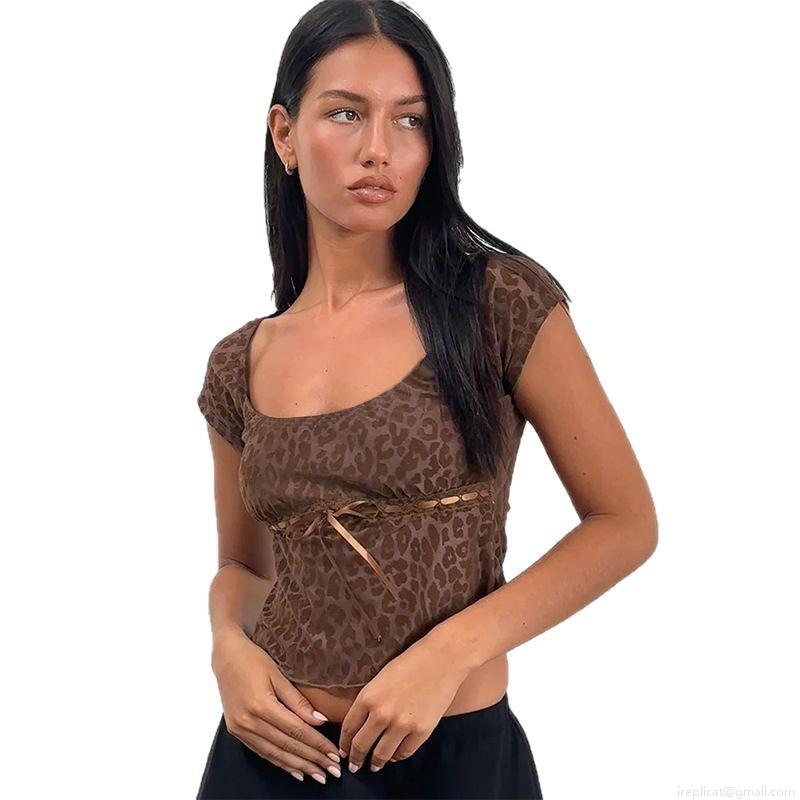 • Women's Sexy Leopard Print Mesh T-Shirt Vintage Square Neck Short Sleeve Crop Top With Bow Ribbon Lace Trim Slim Fit Streetwear Party Clubwear Summer Fashion