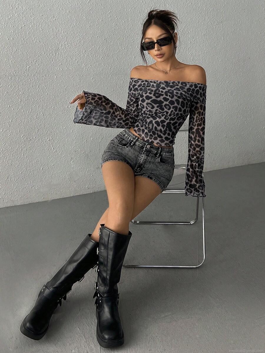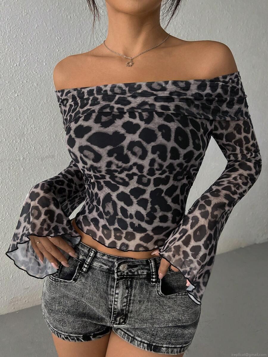 • Women's Sexy Leopard Print Off-Shoulder Bell Sleeve Mesh Top Slim Fit Long Sleeve Streetwear Party Clubwear Crop Blouse Polyester Spandex