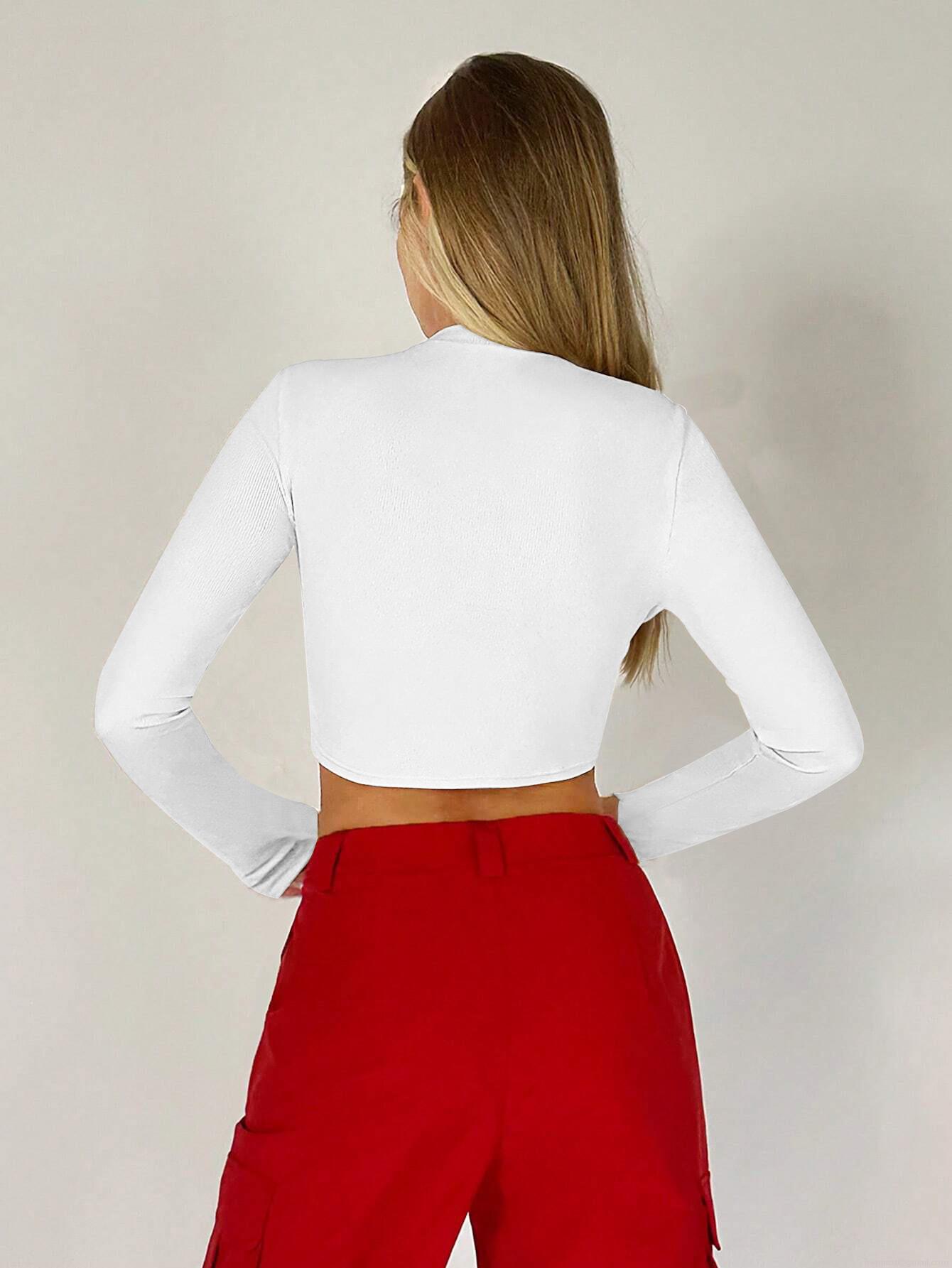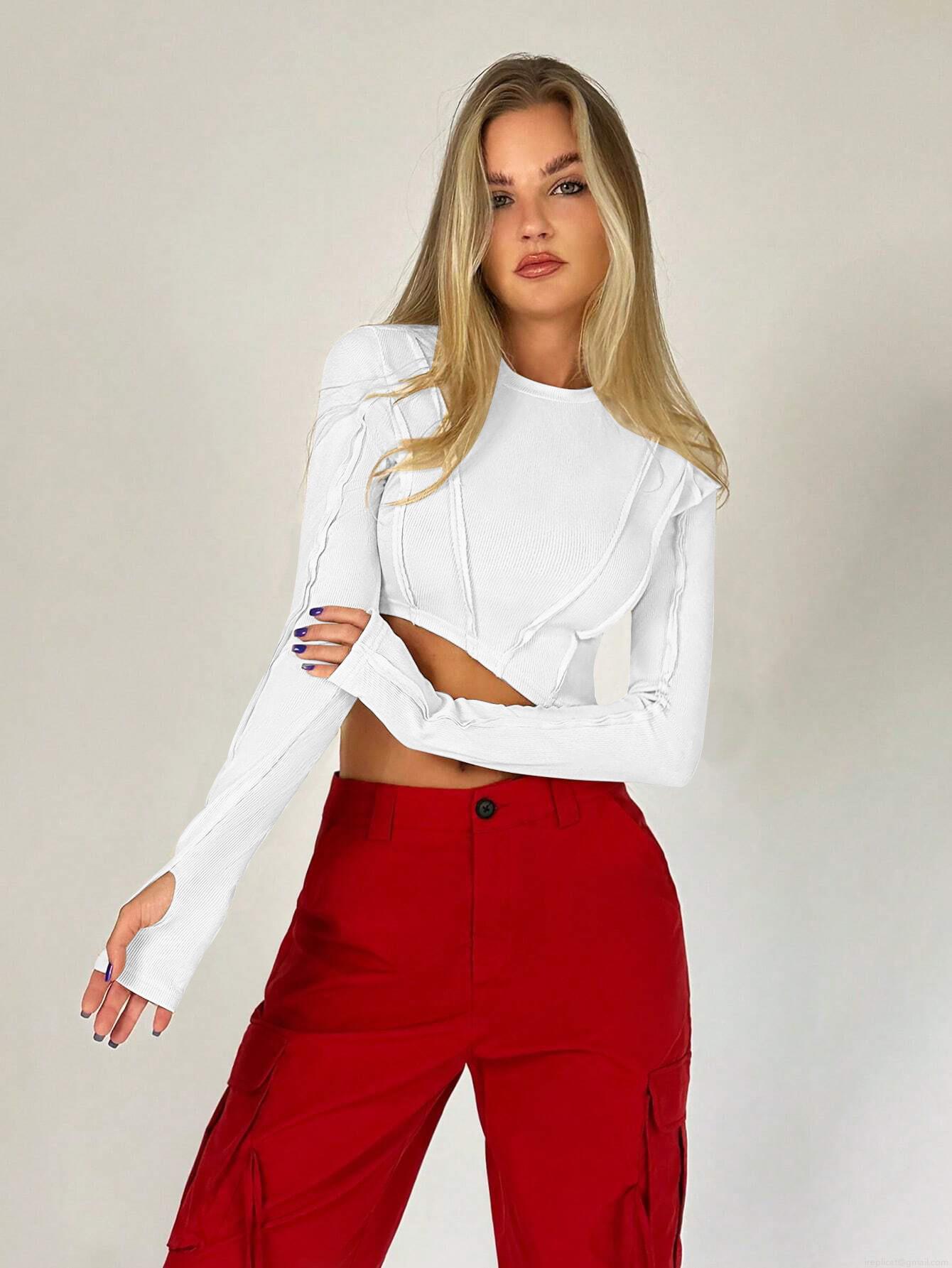 • Women's Sexy Long Sleeve Crop Top Round Neck Irregular Hem Ribbed Knit Pullover T-Shirt Exposed Seams Thumb Holes Slim Fit Streetwear Daily Party Top