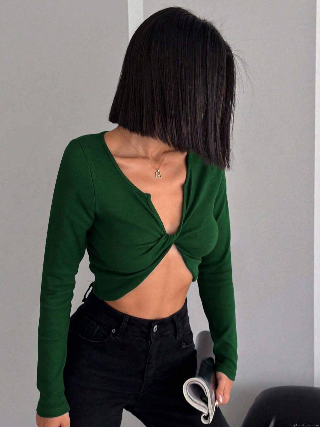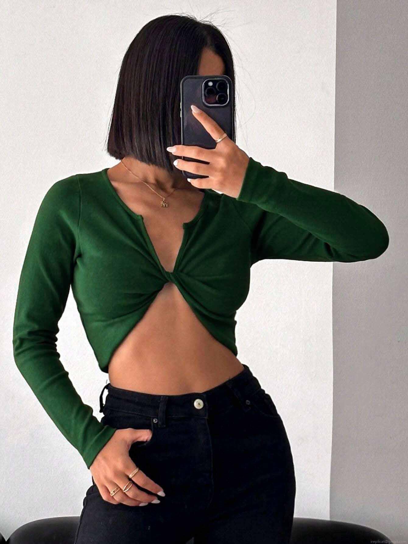 • Women's Sexy Long Sleeve Crop Top Twist Front Cotton Polyester Blend Ribbed Knit T-Shirt Slim Fit Solid Color Clubwear Streetwear Tee For Lady