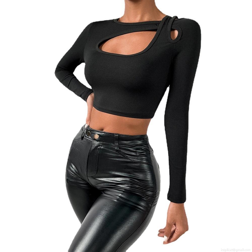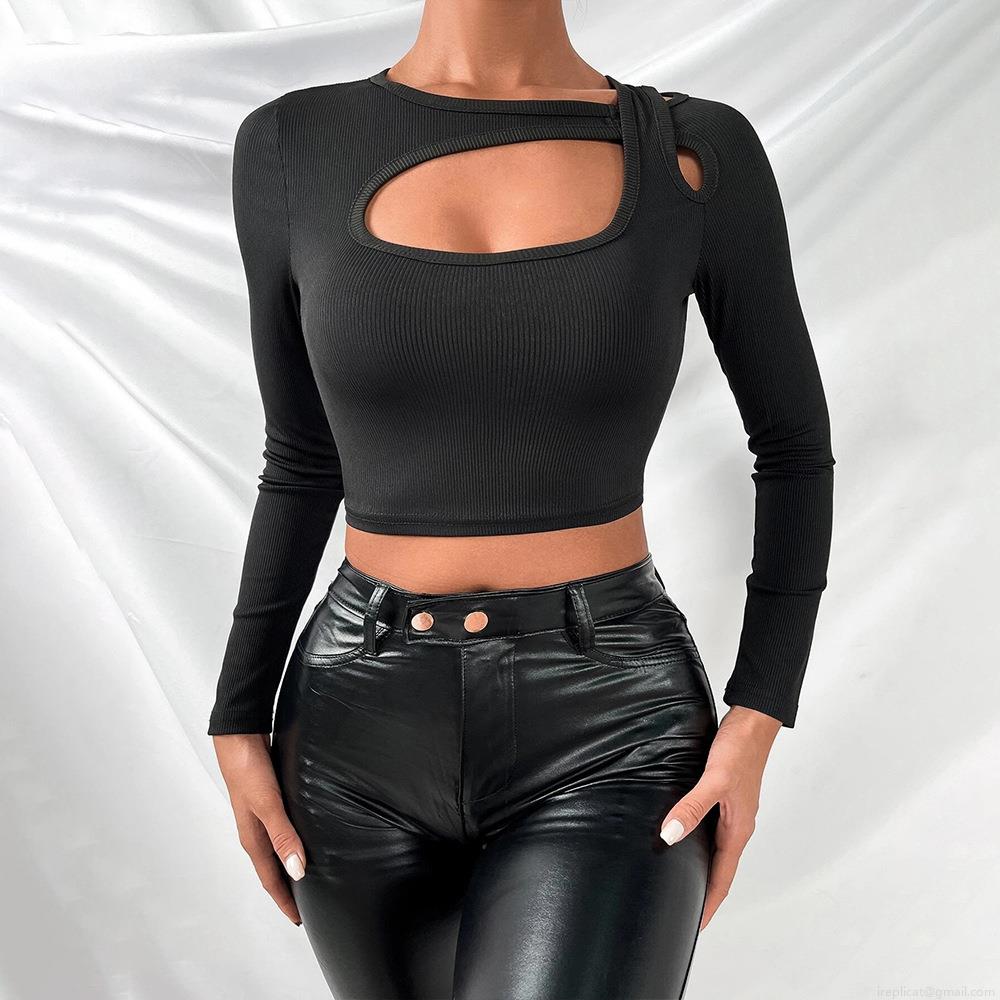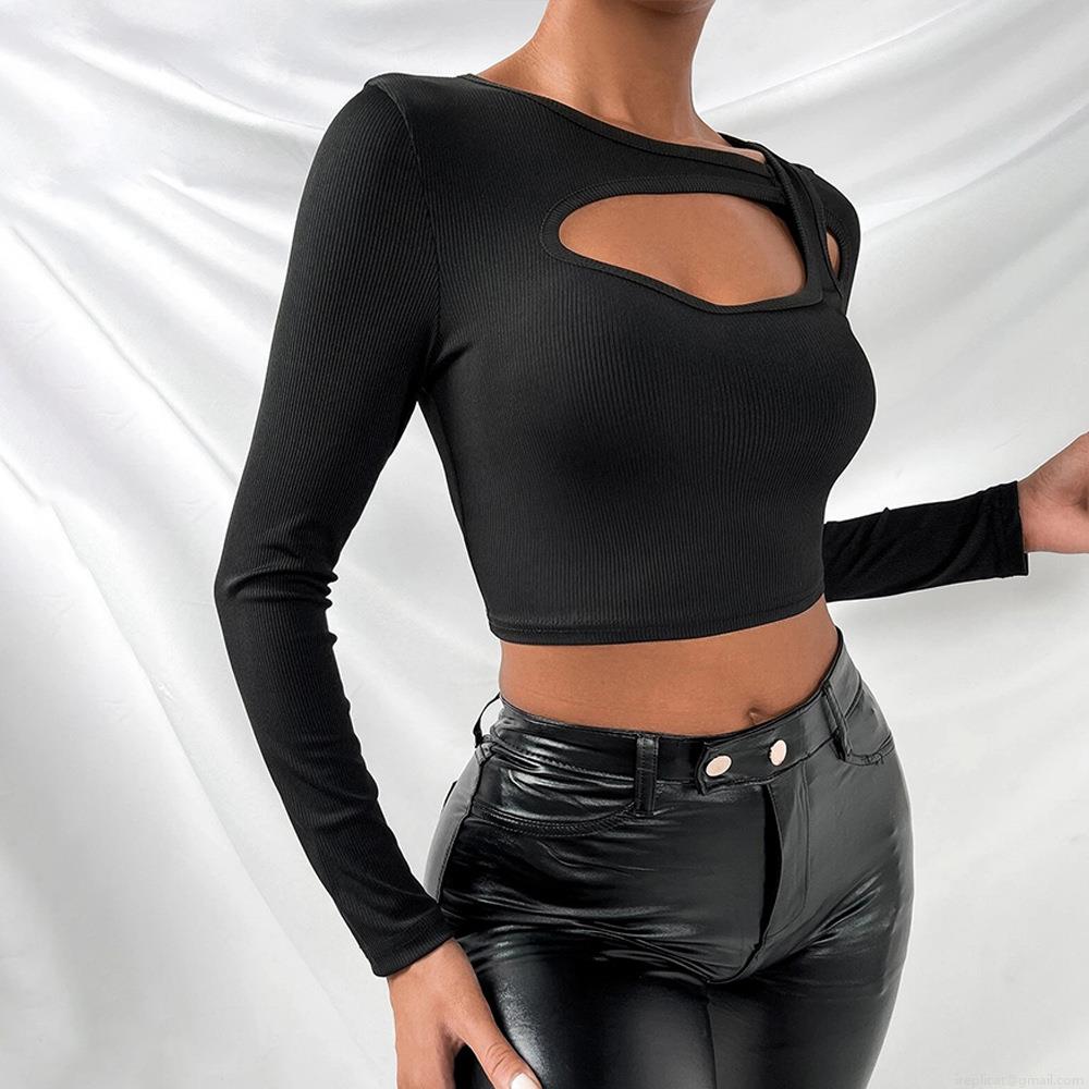 • Women's Sexy Long Sleeve Cutout Front Crop Top Ribbed Knit Slim Fit Solid Color T-Shirt For Streetwear Club Party Fashion