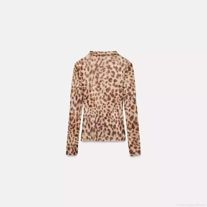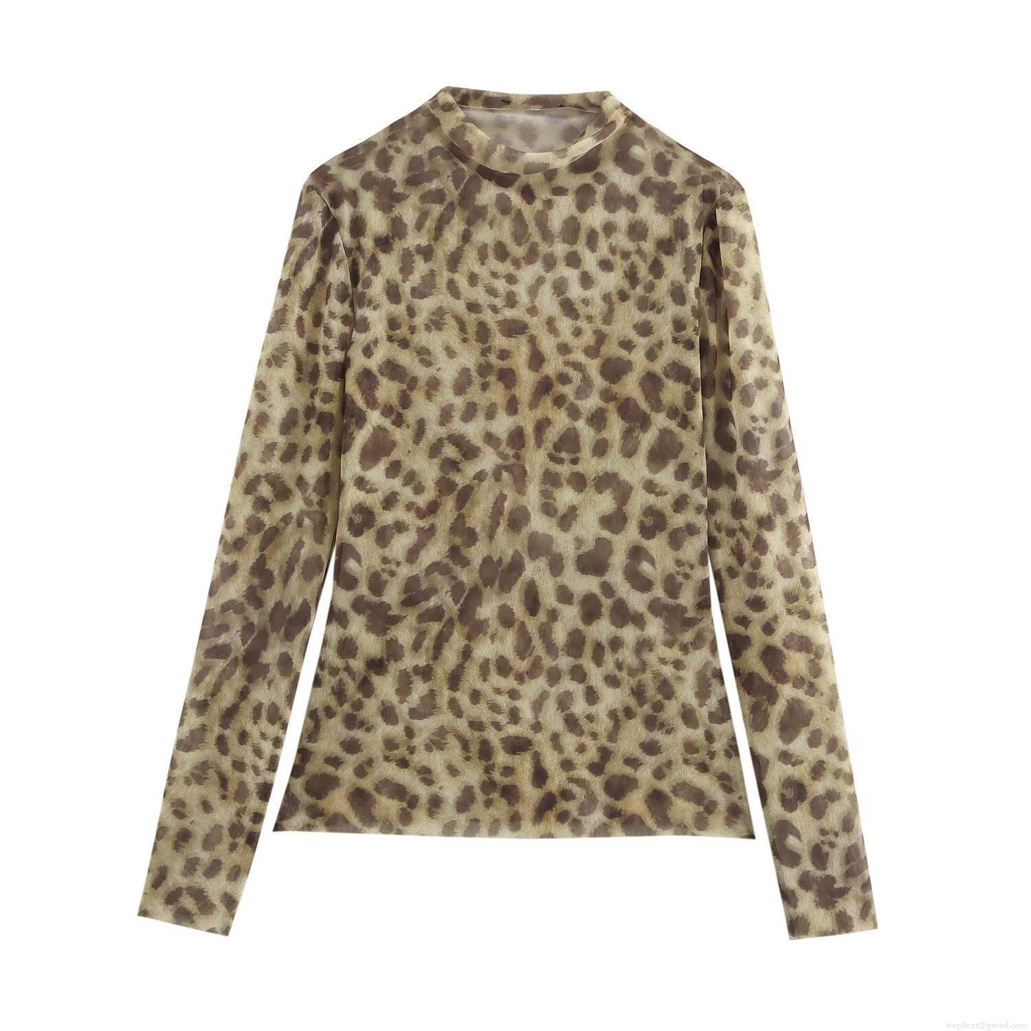 • Women's Sexy Mesh Long Sleeve Top Semi-High Neck Slim Fit Leopard Print Tie-Dye Polyester Bottoming Shirt Fashion Streetwear Tee