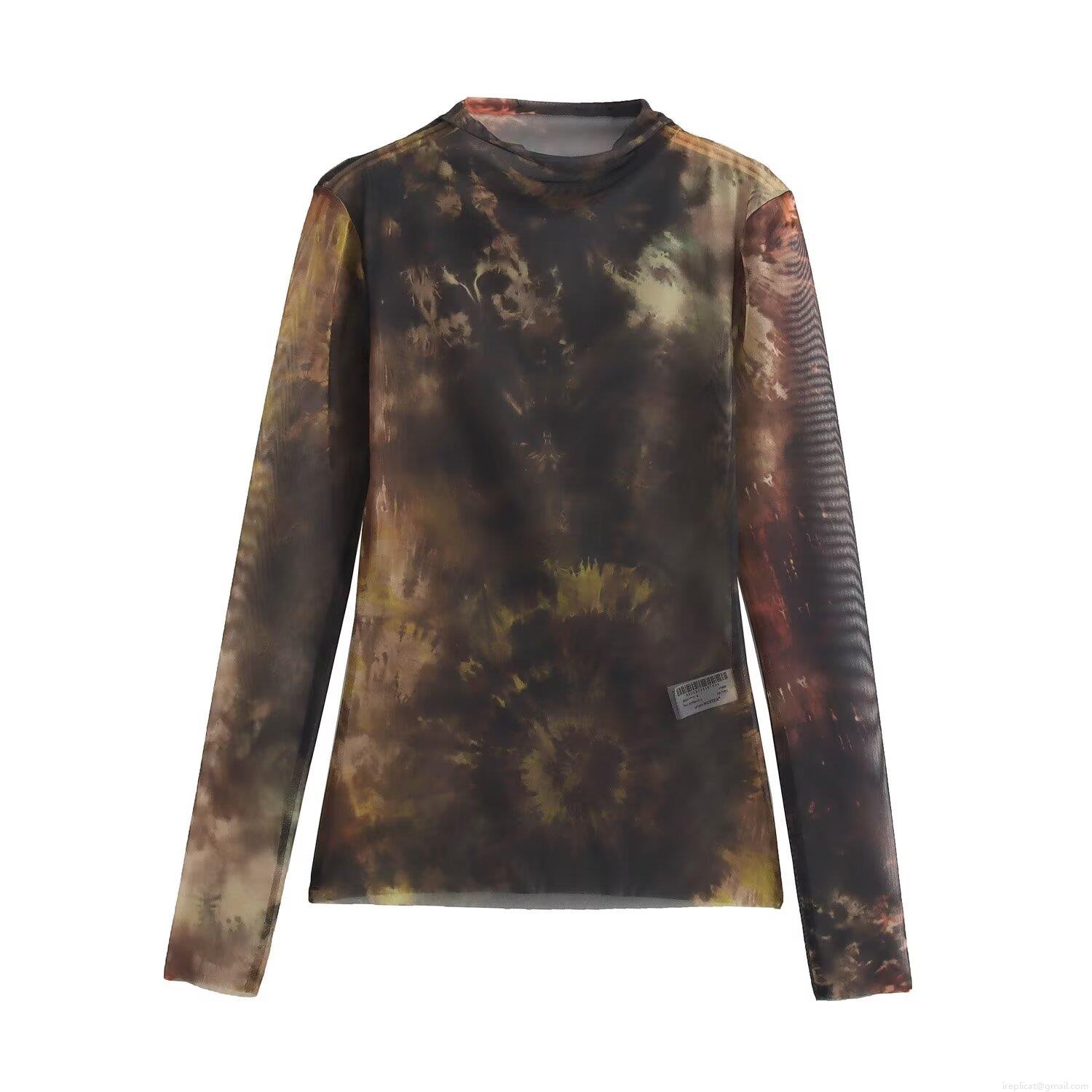 Women's Sexy Mesh Long Sleeve Top Semi-High Neck Slim Fit Leopard Print Tie-Dye Polyester Bottoming Shirt Fashion Streetwear Tee