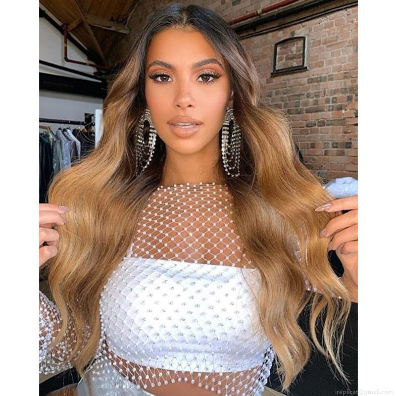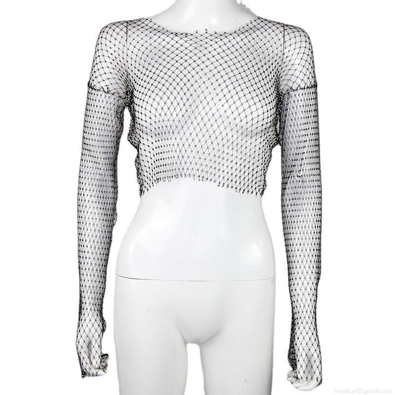 • Women's Sexy Mesh Rhinestone Crop Top Hollow Out See Through Long Sleeve Fishnet Blouse Clubwear Party Streetwear Sparkling Diamond Tops