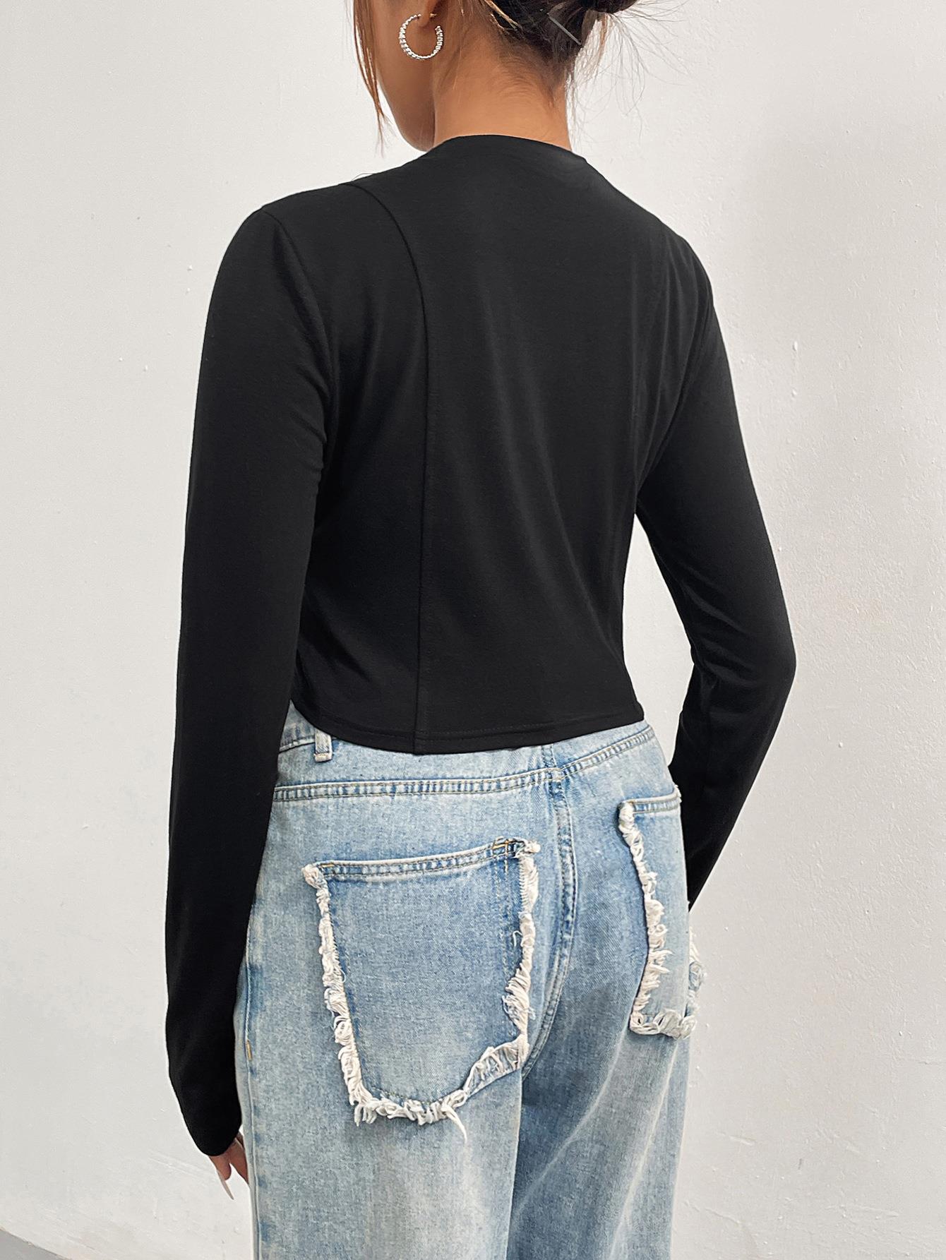 Women's Sexy Mock Neck Long Sleeve Crop Top Polyester Cotton Blend Slim Fit T-Shirt With WHO CARES Letter Patch Streetwear Casual Basic Tee