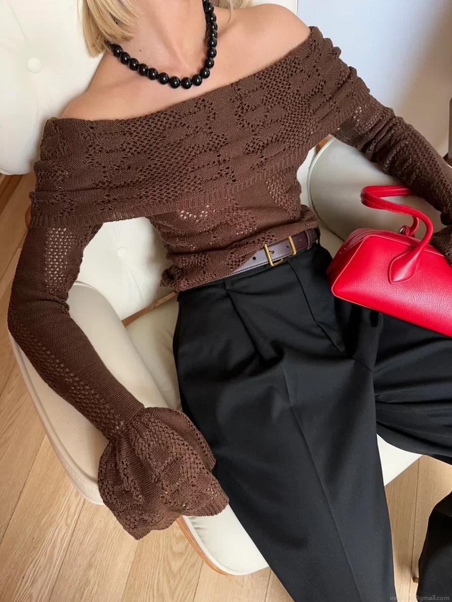 • Women's Sexy Off Shoulder Knit Top Long Flare Sleeve Hollow Out T-Shirt Cotton Polyester Blend Slim Fit Streetwear Casual Spring Autumn Elegant Blouse