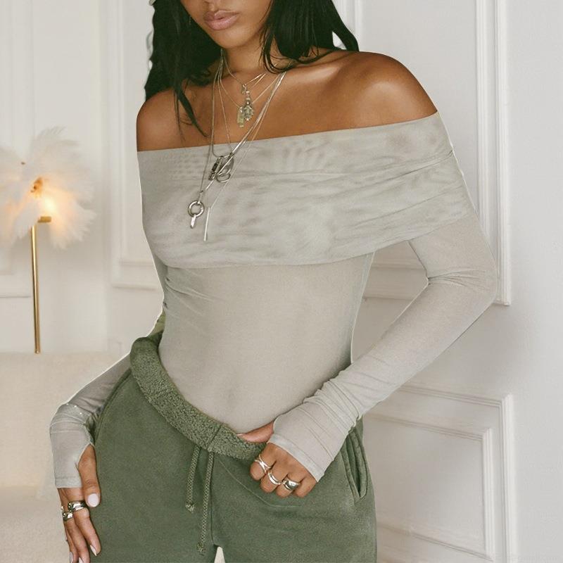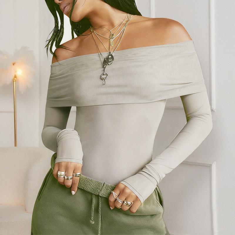 • Women's Sexy Off Shoulder Mesh Long Sleeve T-Shirt Slim Fit Polyester Mesh Ruched Top for Casual Party Streetwear Daily Wear Fashion