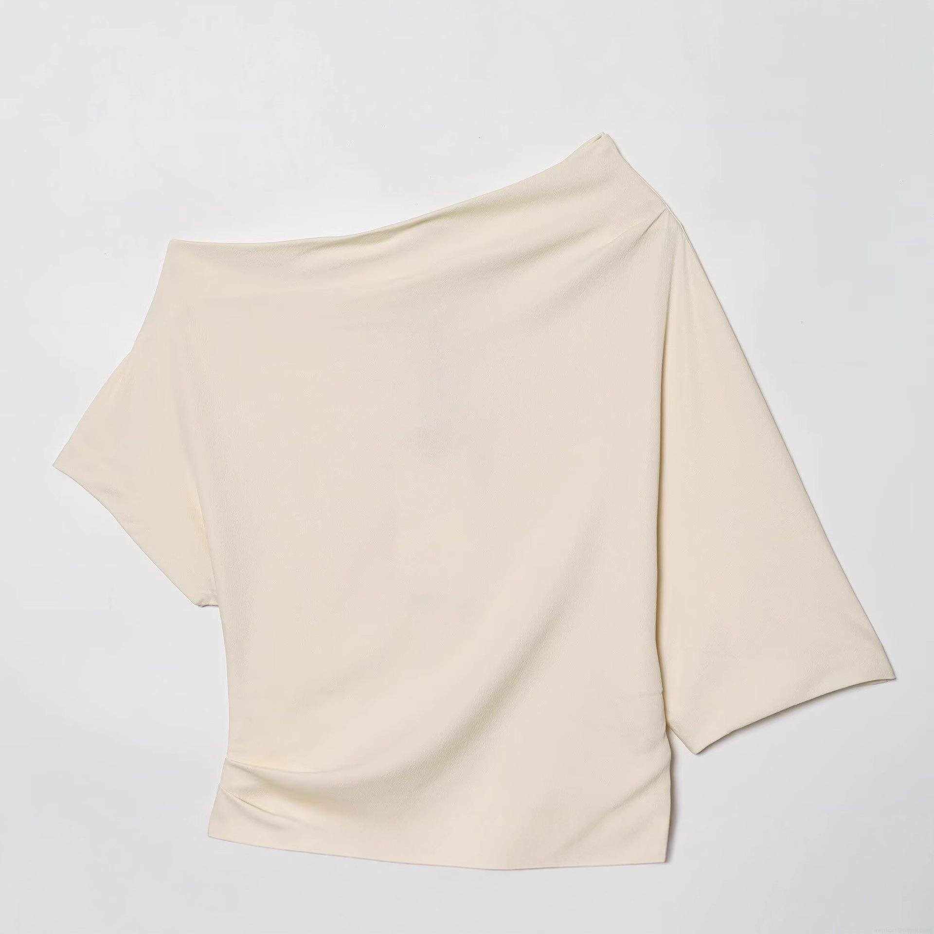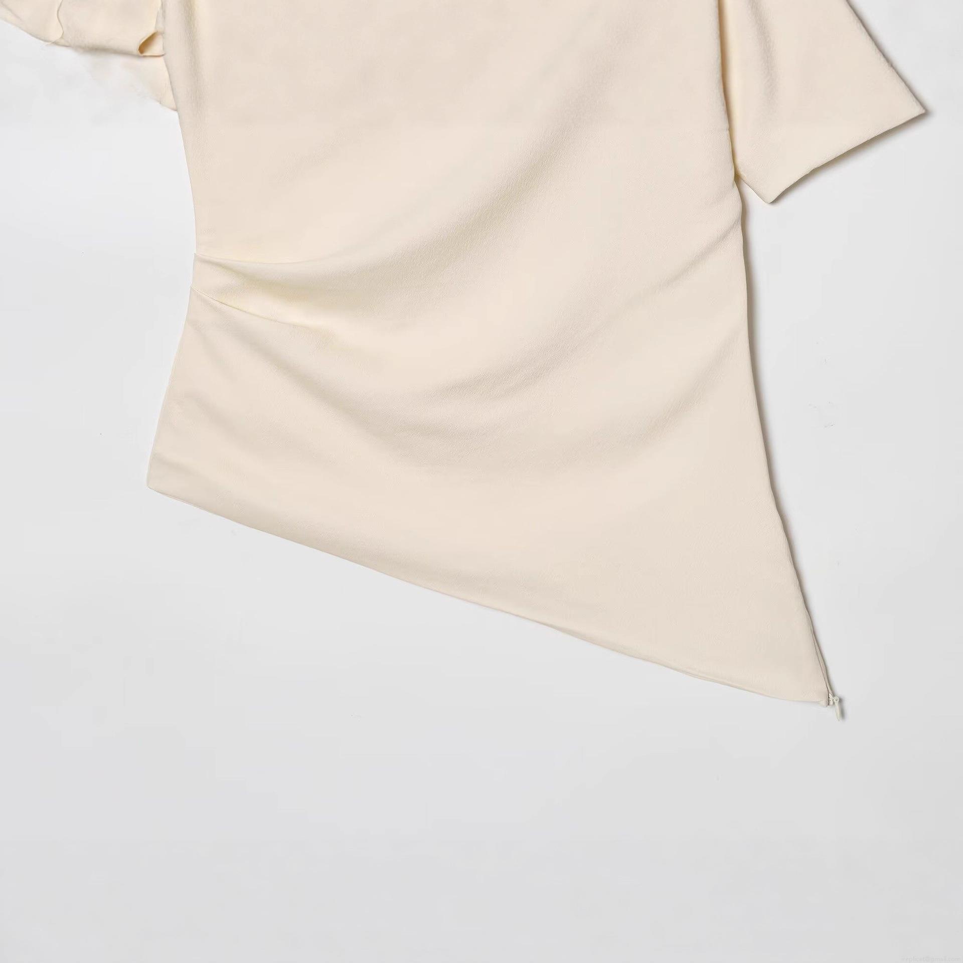 • Women's Sexy Off Shoulder Pleated T-Shirt Asymmetric Slim Fit Short Sleeve Satin Wrinkle Top Solid Color Beige Casual Streetwear For Lady