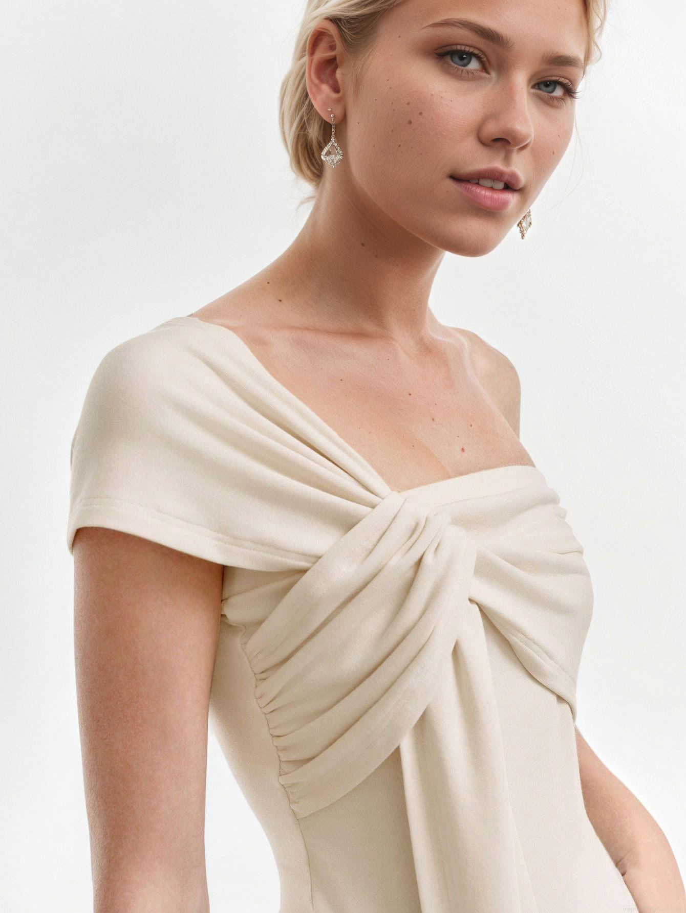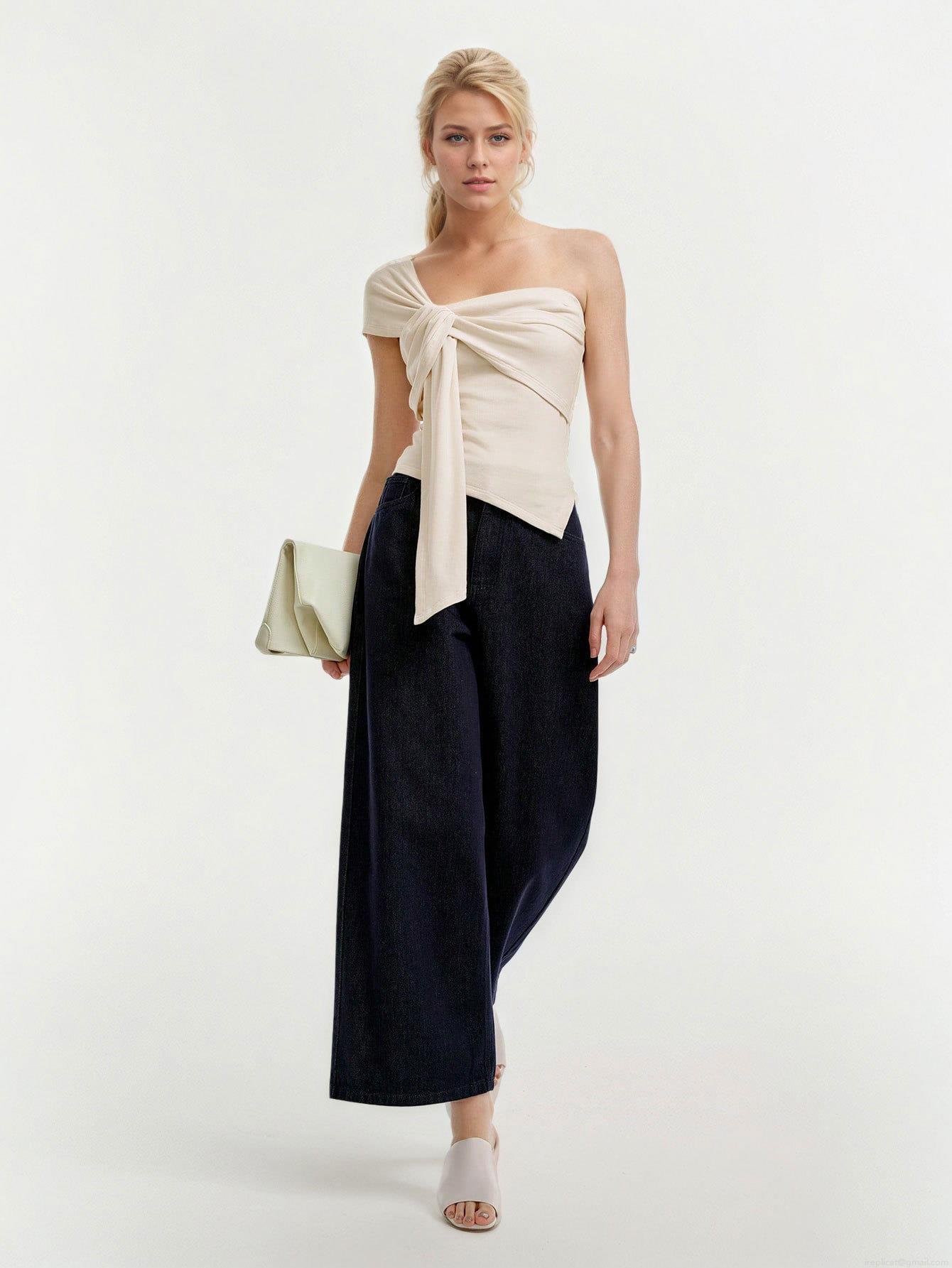 Solid Color, Off-shoulder, Asymmetrical Design, Knot Decoration