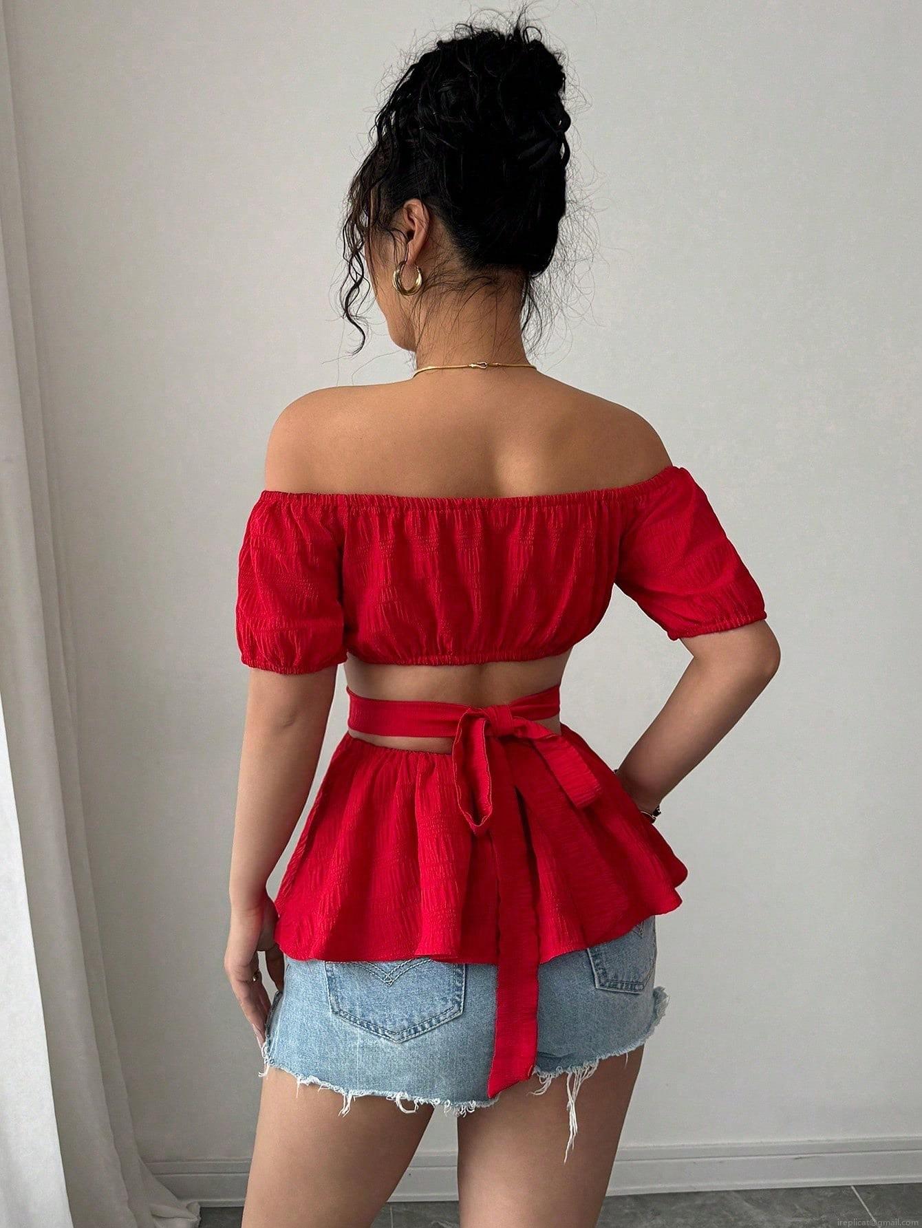 • Women's Sexy Off-Shoulder T-Shirt Polyester Elastane Short Puff Sleeve Cut Out Waist Smocked Texture Back Tie Ruffle Hem Top For Summer Vacation Party