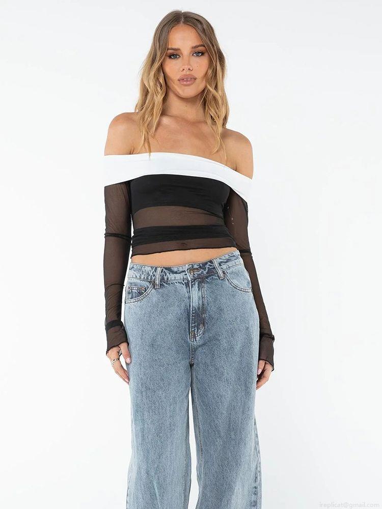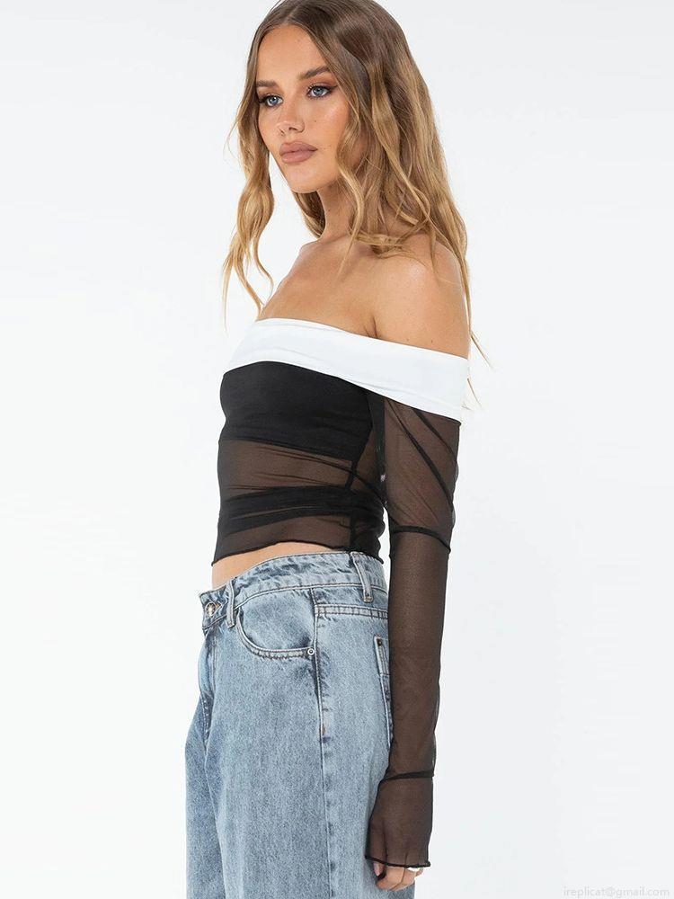 • Women's Sexy Off-The-Shoulder Mesh Long Sleeve T-Shirt Color Block Cut-Out See-Through Slim Fit Crop Top Streetwear Blouse