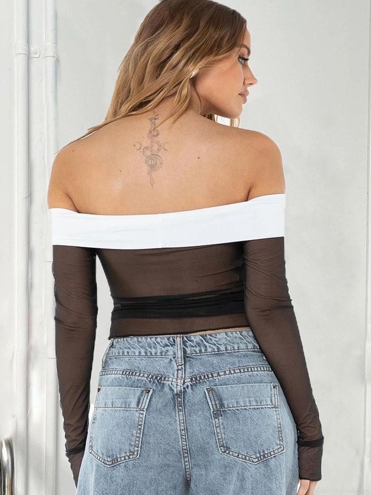 Women's Sexy Off-The-Shoulder Mesh Long Sleeve T-Shirt Color Block Cut-Out See-Through Slim Fit Crop Top Streetwear Blouse
