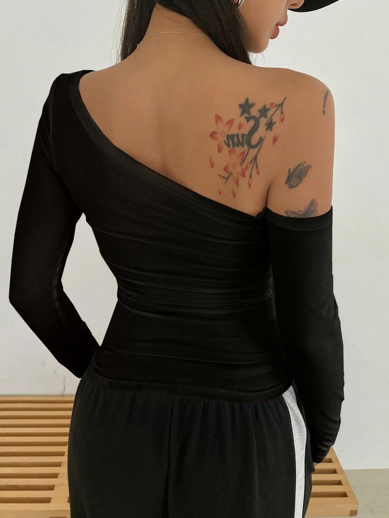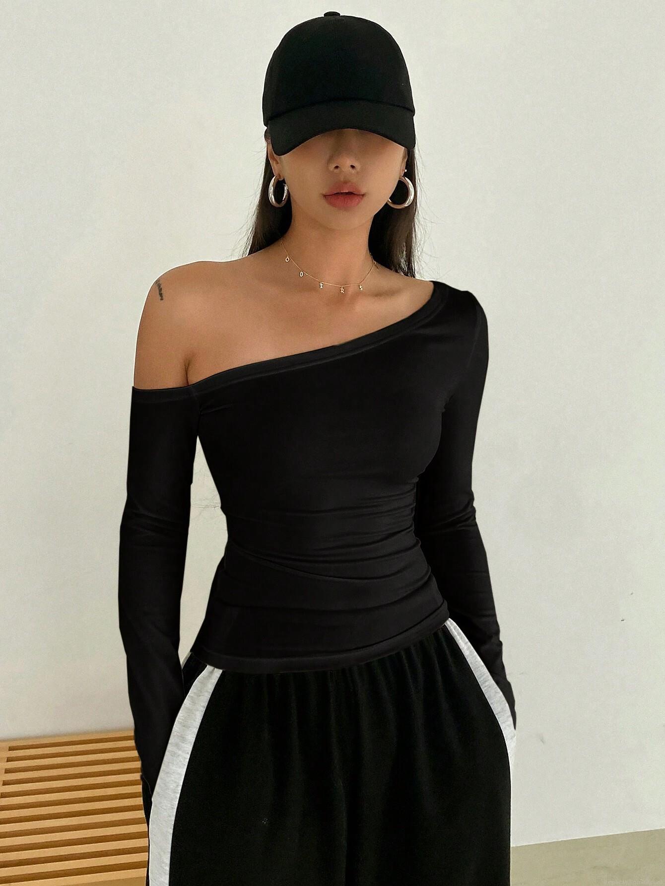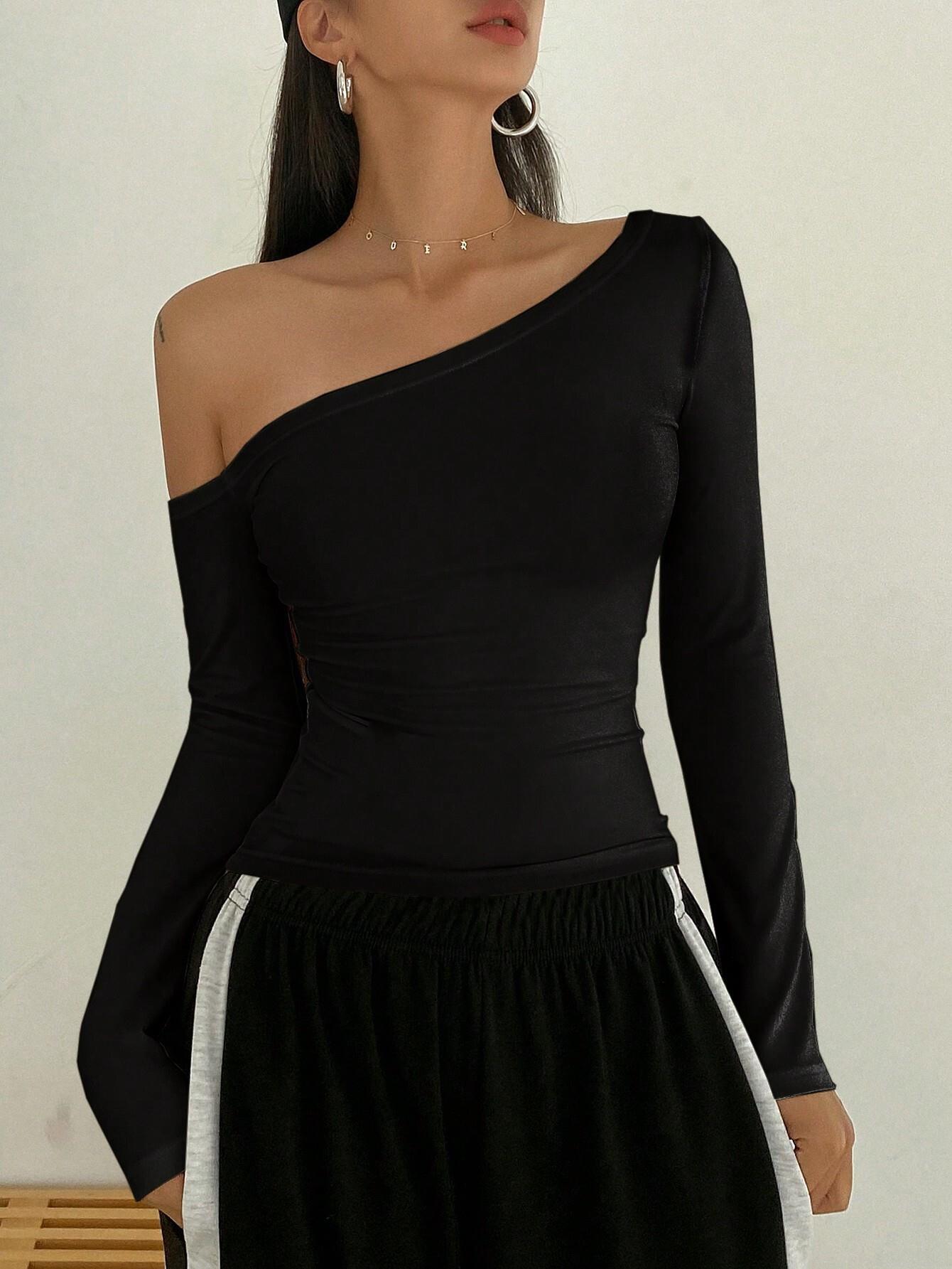 • Women's Sexy One Shoulder Off Long Sleeve T-Shirt Viscose Elastane Slim Fit Solid Black Top Autumn Winter Casual Pullover