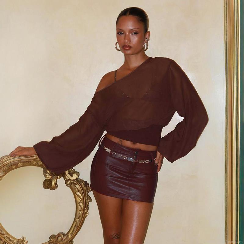 • Women's Sexy One Shoulder Sheer Mesh Blouse Long Lantern Sleeve Polyester Spandex Smocked Waist Slim Fit Top For Club Party Nightwear