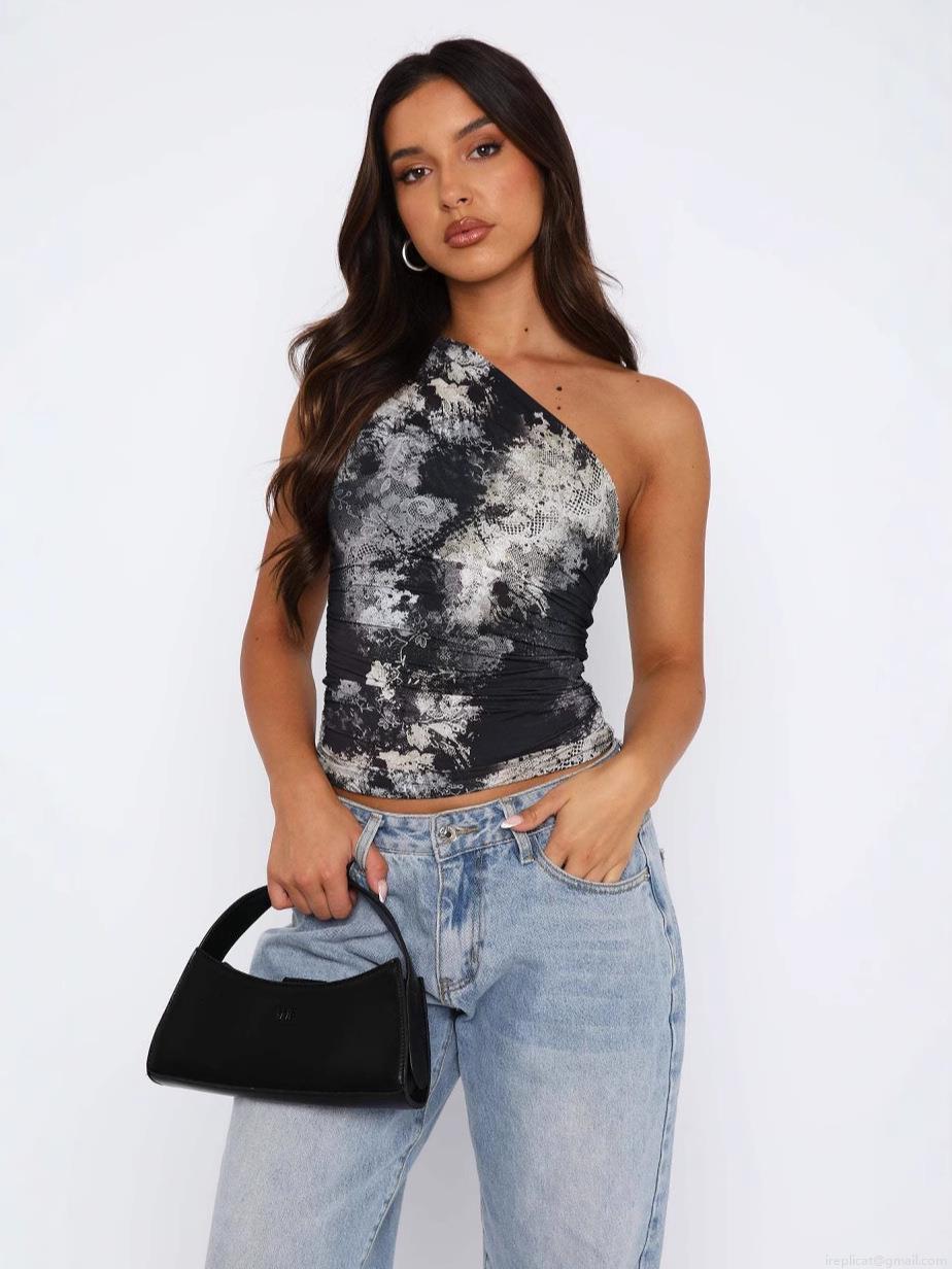 Women's Sexy One Shoulder Tank Top Y2K Slim Fit Cropped Ruched Shirt Milk Silk Summer Streetwear Party Tie Dye Floral Print Top