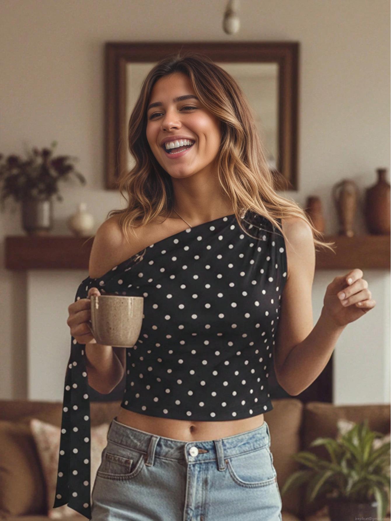 • Women's Sexy Polka Dot One Shoulder Crop Top With Tie Up Bow Shoulder 95% Polyester 5% Elastane Slim Fit Summer Casual Sleeveless Top