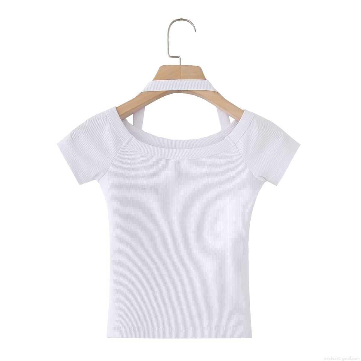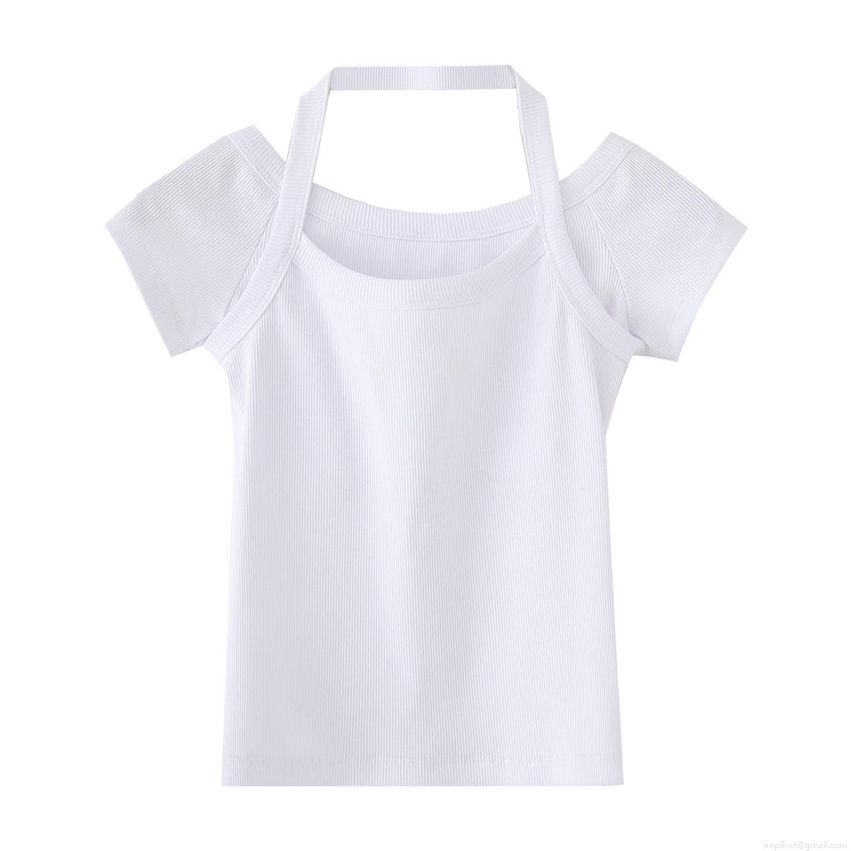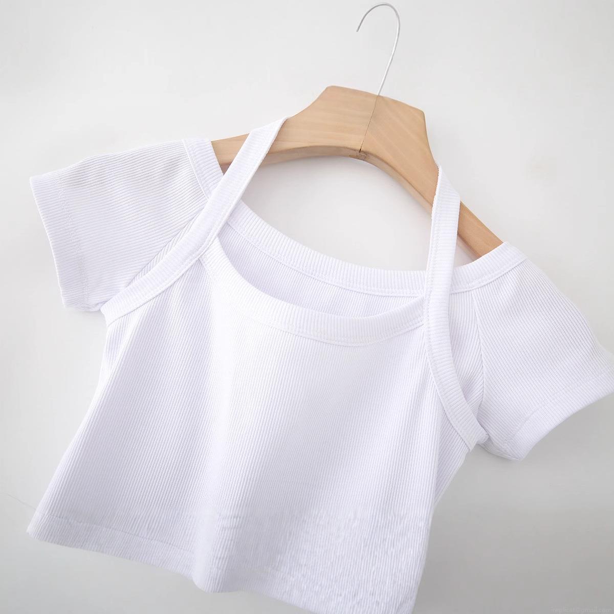• Women's Sexy Ribbed Cotton Blend Halter Neck Layered Off-Shoulder Short Sleeve Crop Top Slim Fit Solid White Knitted T-Shirt Summer Streetwear