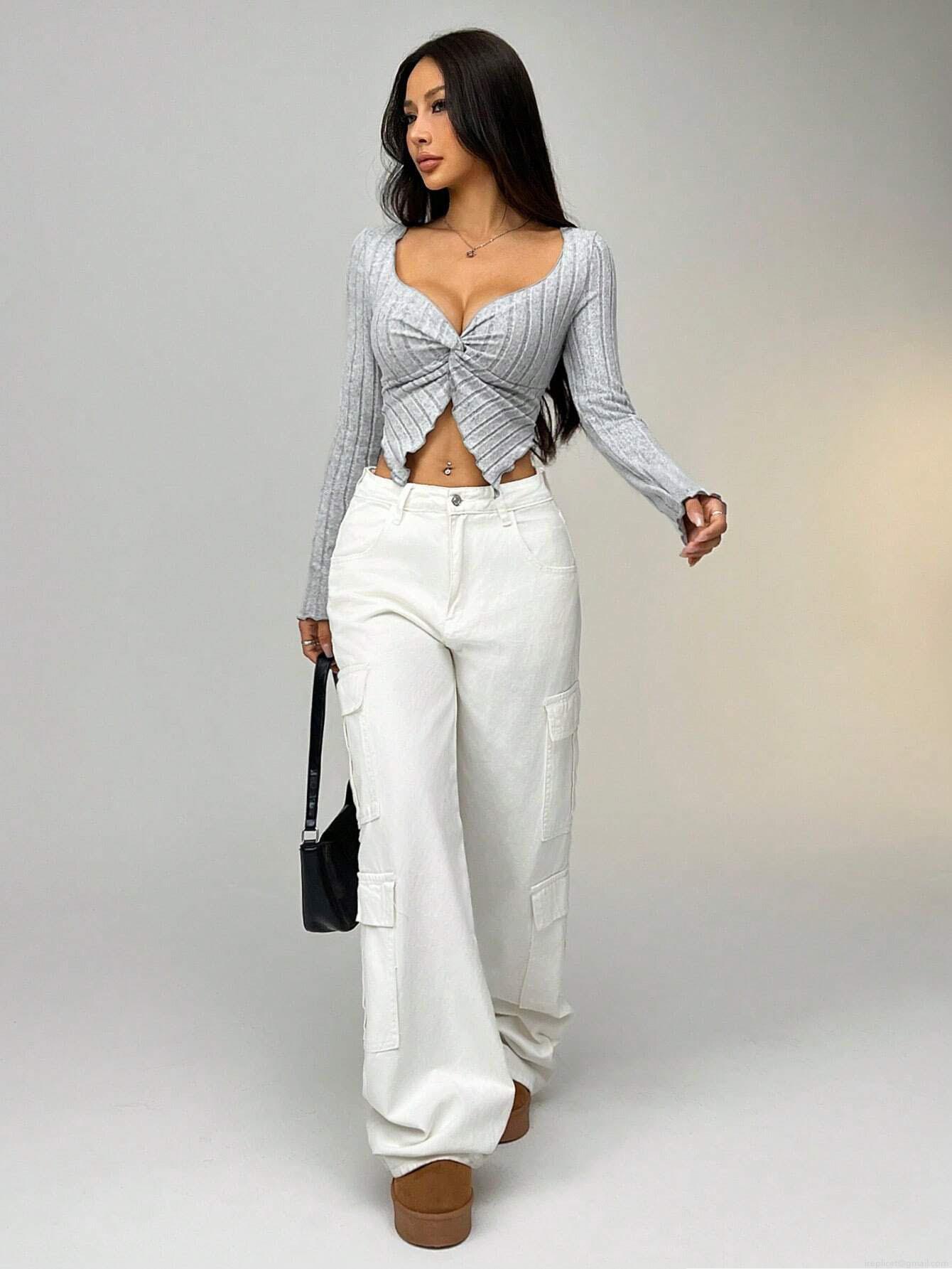 • Women's Sexy Ribbed Knit Long Sleeve Cropped T-Shirt Sweetheart Neck Knot Front Slim Fit Navel Top Fall Winter Solid Color Tee