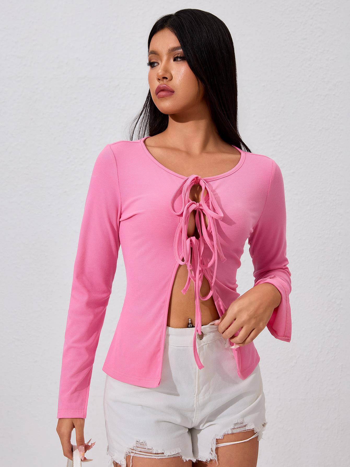 • Women's Sexy Ribbed Knit Tie-Front Long Sleeve T-Shirt Viscose Polyester Blend Cutout Cardigan Top Y2K Style Slim Fit Streetwear